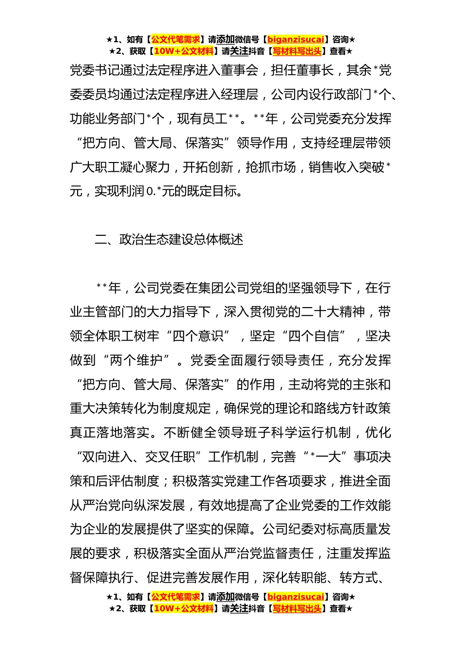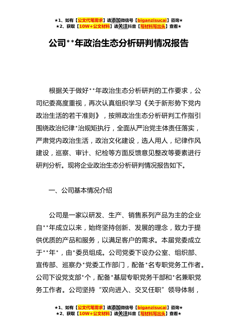 ★1、如有【公文代笔需求】请添加微信号【biganzisucai】咨询★★2、获取【10W+公文材料】请关注抖音【写材料写出头】查看★公司**年政治生态分析研判情况报告根据关于做好**年政治生态分析研判的工作要求,公司纪委高度重视,再次认真组织学习《关于新形势下党内政治生活的若干准则》,按照政治生态分析研判工作指引围绕政治纪律*治规矩执行,全面从严治党主体责任落实,严肃党内政治生活,政治文化建设,选人用人,纪律作风建设,巡察、审计、纪检等方面反馈意见整改等要素进行研判分析。现将企业政治生态分析研判情况报告如下。一、公司基本情况介绍公司是一家以研发、生产、销售系列产品为主的企业自**年成立以来,始终坚持创新、发展的理念,致力于提供优质的产品和服务,以满足客户的需求。本届党委成立于**...