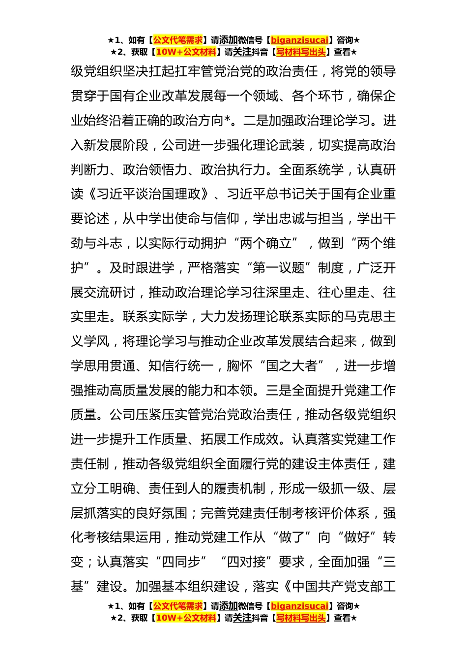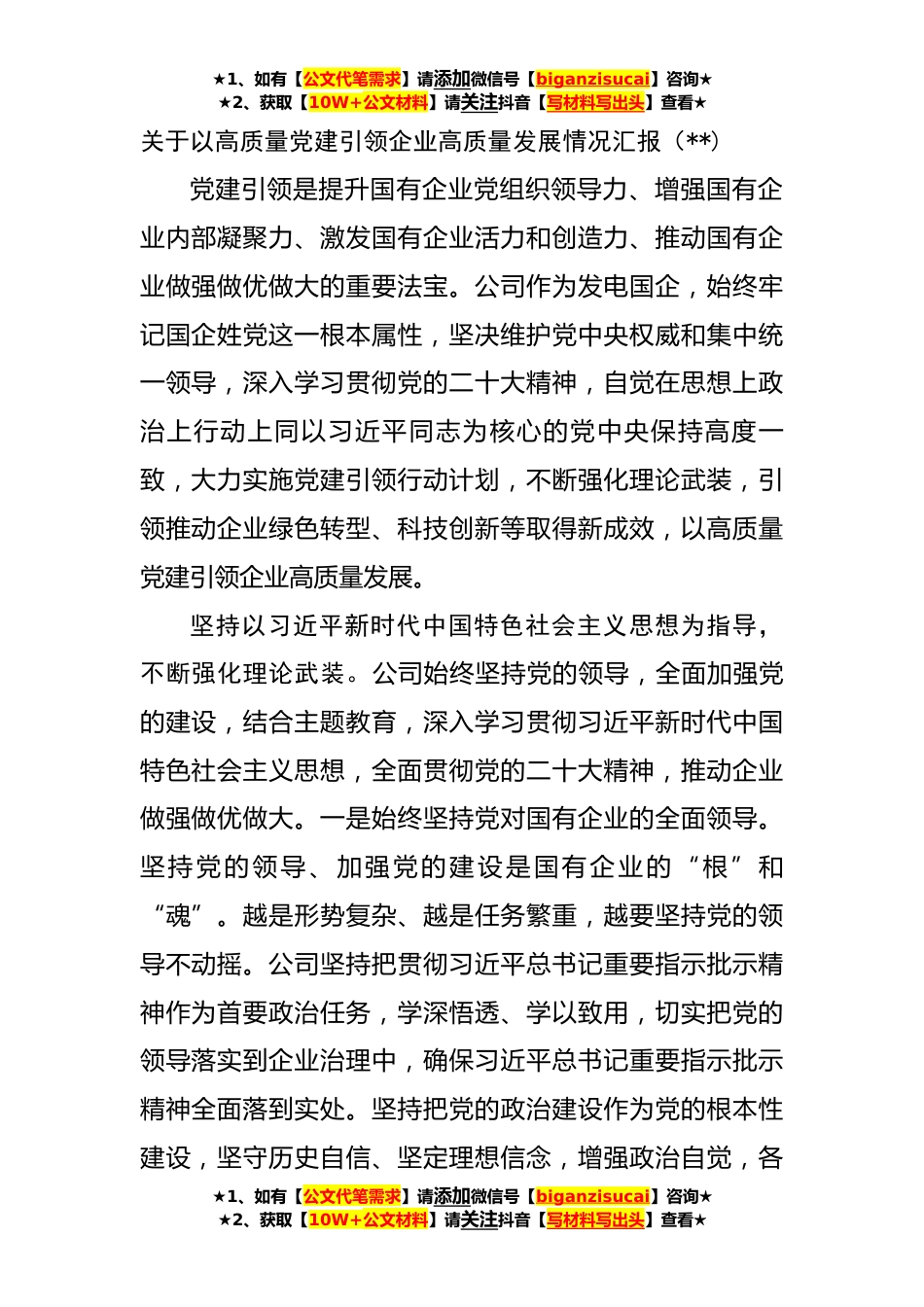★1、如有【公文代笔需求】请添加微信号【biganzisucai】咨询★★2、获取【10W+公文材料】请关注抖音【写材料写出头】查看★关于以高质量党建引领企业高质量发展情况汇报(**)党建引领是提升国有企业党组织领导力、增强国有企业内部凝聚力、激发国有企业活力和创造力、推动国有企业做强做优做大的重要法宝。公司作为发电国企,始终牢记国企姓党这一根本属性,坚决维护党中央权威和集中统一领导,深入学习贯彻党的二十大精神,自觉在思想上政治上行动上同以习近平同志为核心的党中央保持高度一致,大力实施党建引领行动计划,不断强化理论武装,引领推动企业绿色转型、科技创新等取得新成效,以高质量党建引领企业高质量发展。坚持以习近平新时代中国特色社会主义思想为指导,不断强化理论武装。公司始终坚持党的领...