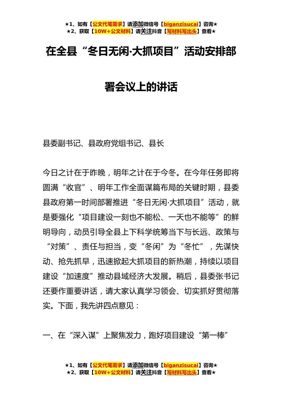 ★1、如有【公文代笔需求】请添加微信号【biganzisucai】咨询★★2、获取【10W+公文材料】请关注抖音【写材料写出头】查看★在全县“冬日无闲·大抓项目”活动安排部署会议上的讲话县委副书记、县政府党组书记、县长今日之计在于昨晚,明年之计在于今冬。在今年任务即将圆满“收官”、明年工作全面谋篇布局的关键时期,县委县政府第一时间部署推进“冬日无闲·大抓项目”活动,就是要强化“项目建设一刻也不能松、一天也不能等”的鲜明导向,动员引导全县上下科学统筹当下与长远、政策与“对策”、责任与担当,变“冬闲”为“冬忙”,先谋快动、抢先抓早,迅速掀起大抓项目的新热潮,持续以项目建设“加速度”推动县域经济大发展。稍后,县委张书记还要作重要讲话,请大家认真学习领会、切实抓好贯彻落实。下面,...