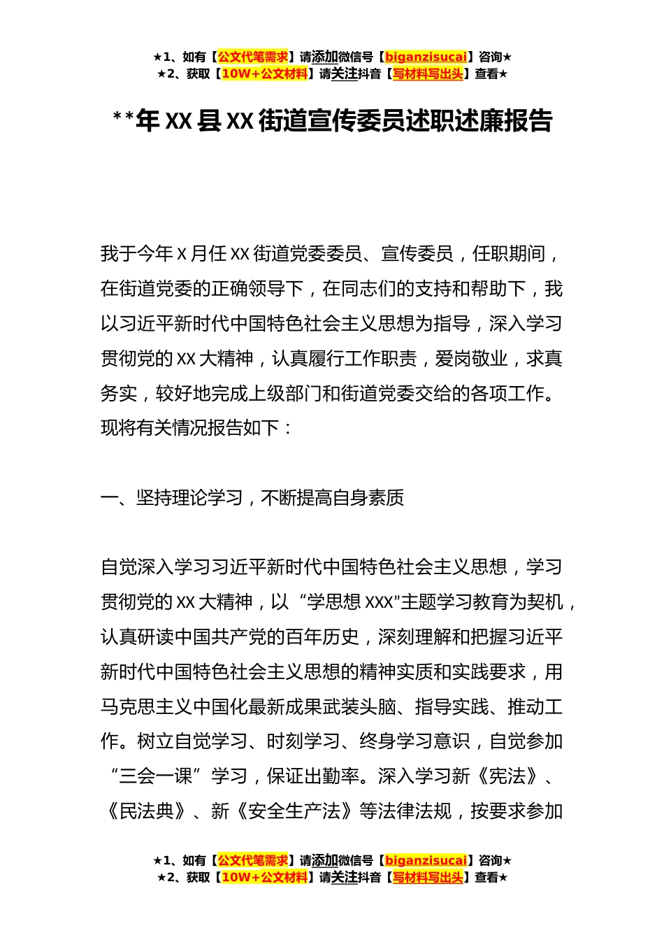 ★1、如有【公文代笔需求】请添加微信号【biganzisucai】咨询★★2、获取【10W+公文材料】请关注抖音【写材料写出头】查看★**年XX县XX街道宣传委员述职述廉报告我于今年X月任XX街道党委委员、宣传委员,任职期间,在街道党委的正确领导下,在同志们的支持和帮助下,我以习近平新时代中国特色社会主义思想为指导,深入学习贯彻党的XX大精神,认真履行工作职责,爱岗敬业,求真务实,较好地完成上级部门和街道党委交给的各项工作。现将有关情况报告如下:一、坚持理论学习,不断提高自身素质自觉深入学习习近平新时代中国特色社会主义思想,学习贯彻党的XX大精神,以“学思想XXX”主题学习教育为契机,认真研读中国共产党的百年历史,深刻理解和把握习近平新时代中国特色社会主义思想的精神实质和实践要求,用马克...