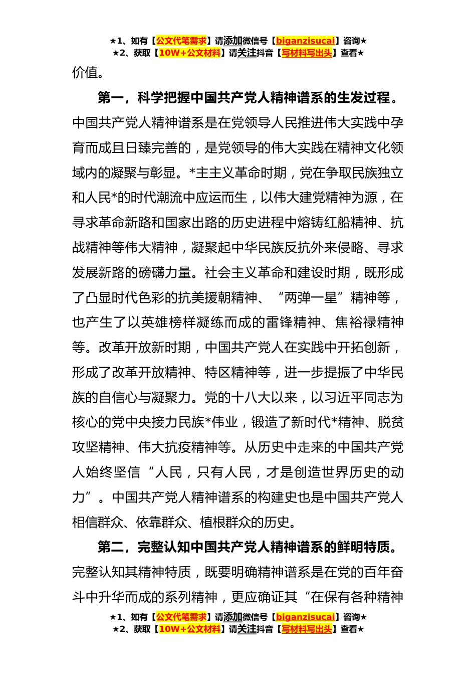 ★1、如有【公文代笔需求】请添加微信号【biganzisucai】咨询★★2、获取【10W+公文材料】请关注抖音【写材料写出头】查看★党课讲稿:大力弘*国共产党人精神谱系(**字)同志们:中国共产党团结带领中国人民立足时代要求,把握历史主动,在百年征程中不断推进历史伟业、淬炼理想信念、坚定宗旨目标,形成了以伟大建党精神为源头的内蕴时代特点和鲜明底色的系列伟大精神,“在长期奋斗中构建起中国共产党人的精神谱系”。中国共产党人精神谱系深刻昭示着百年大党风华正茂的“基因密码”,集中彰显了中国共产党的鲜明政治品格与根本价值取向,是中国共产党人接续奋斗的精神源动力。新时代,中国共产党立足民族*的时代视阈,为继续走好新的“赶考”之路,有必要从“知、情、意、行”四重向度深刻审视中国共产党人精...