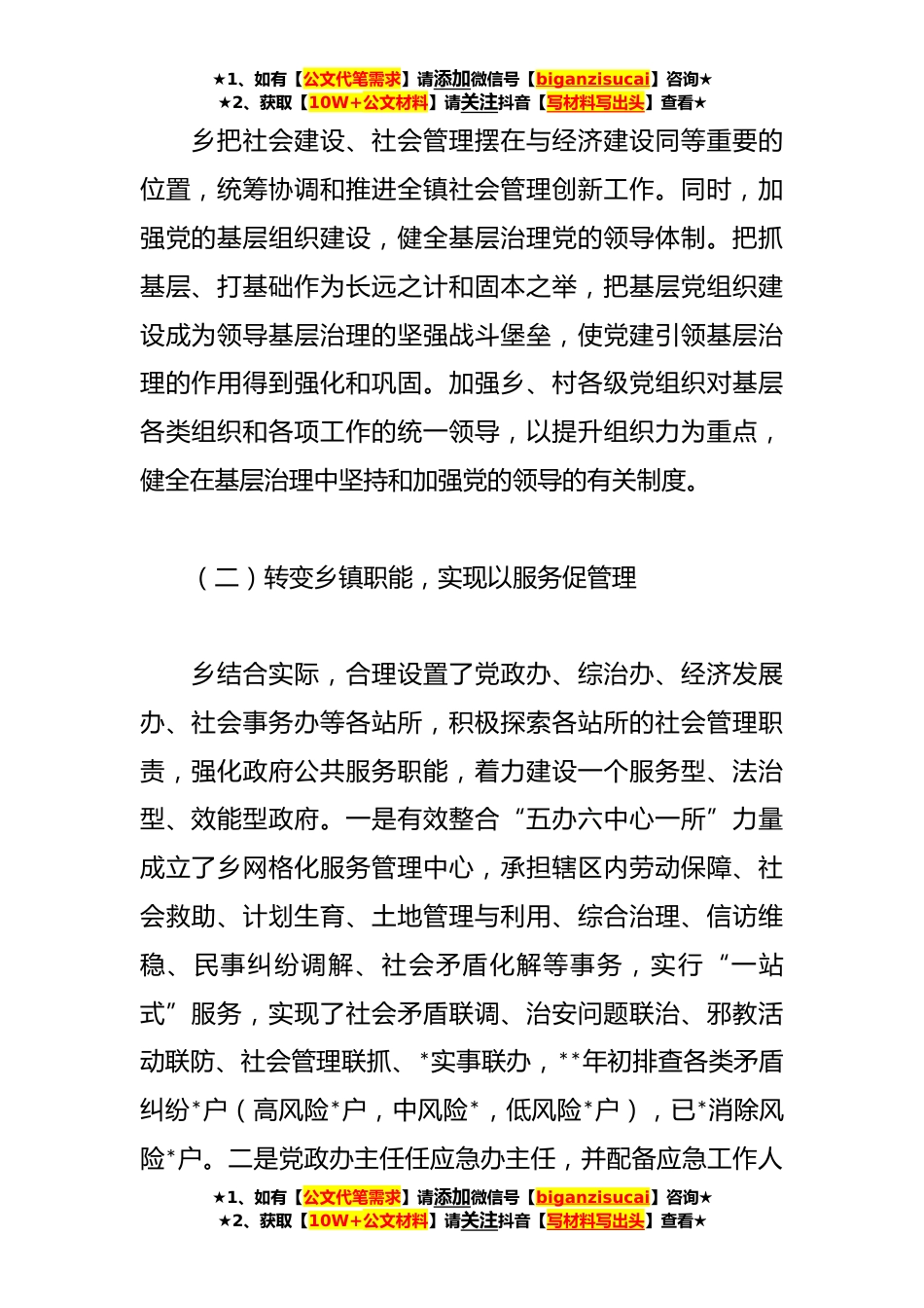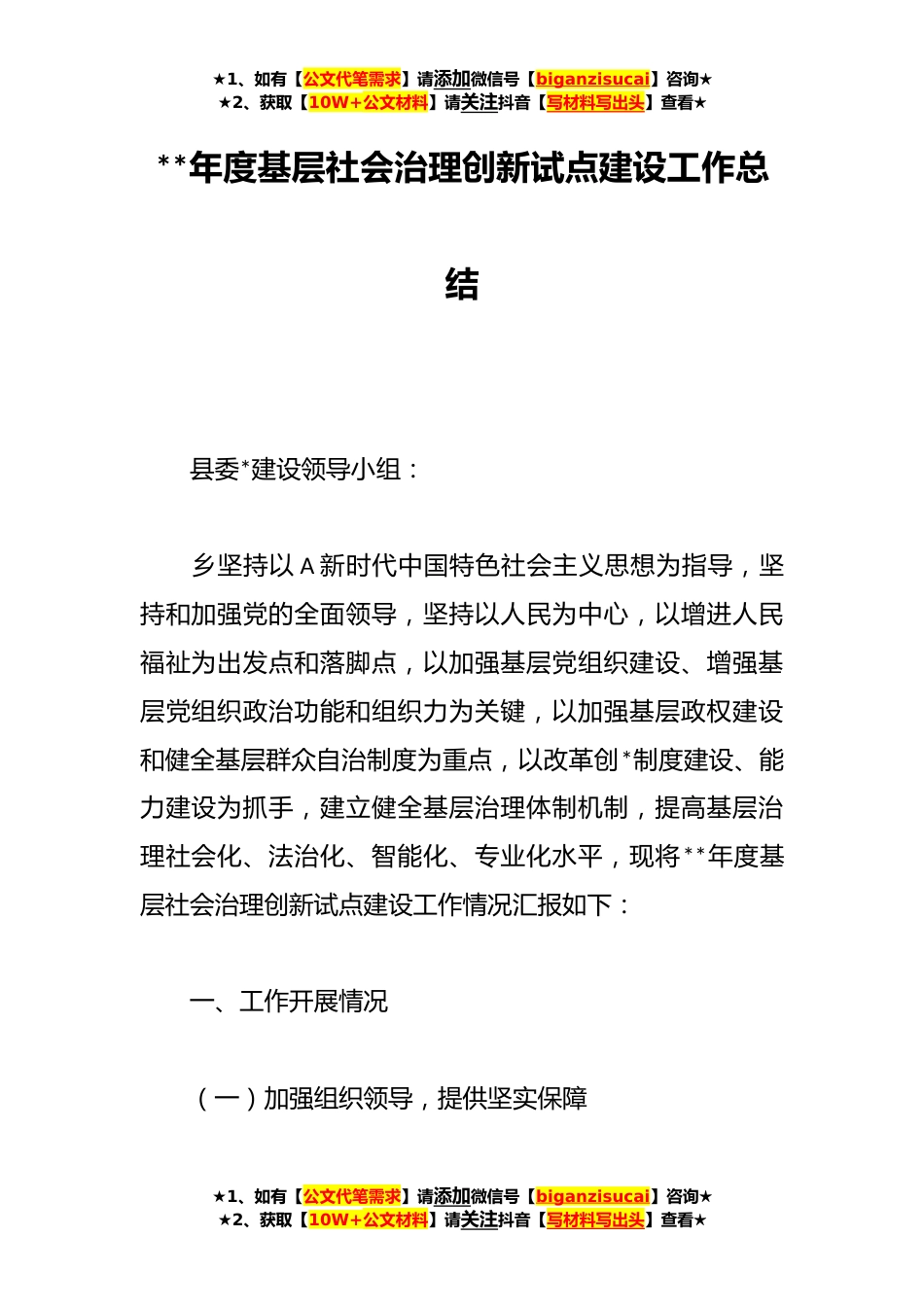 ★1、如有【公文代笔需求】请添加微信号【biganzisucai】咨询★★2、获取【10W+公文材料】请关注抖音【写材料写出头】查看★**年度基层社会治理创新试点建设工作总结县委*建设领导小组:乡坚持以A新时代中国特色社会主义思想为指导,坚持和加强党的全面领导,坚持以人民为中心,以增进人民福祉为出发点和落脚点,以加强基层党组织建设、增强基层党组织政治功能和组织力为关键,以加强基层政权建设和健全基层群众自治制度为重点,以改革创*制度建设、能力建设为抓手,建立健全基层治理体制机制,提高基层治理社会化、法治化、智能化、专业化水平,现将**年度基层社会治理创新试点建设工作情况汇报如下:一、工作开展情况(一)加强组织领导,提供坚实保障★1、如有【公文代笔需求】请添加微信号【biganzisucai】咨...