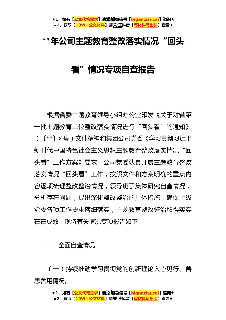 ★1、如有【公文代笔需求】请添加微信号【biganzisucai】咨询★★2、获取【10W+公文材料】请关注抖音【写材料写出头】查看★**年公司主题教育整改落实情况“回头看”情况专项自查报告根据省委主题教育领导小组办公室印发《关于对省第一批主题教育单位整改落实情况进行“回头看”的通知》(〔**〕X号)文件精神和集团公司党委《学习贯彻习近平新时代中国特色社会主义思想主题教育整改落实情况“回头看”工作方案》要求,公司党委认真开展主题教育整改落实情况“回头看”工作,按照文件和方案明确的重点内容逐项梳理整改整治情况,领导班子集体研究自查情况,分析存在问题,提出深化整改整治的具体措施,确保上级党委各项工作要求落细落实,主题教育整改整治取得实实在在成效。现将有关情况专项报告如下。一、全面自...