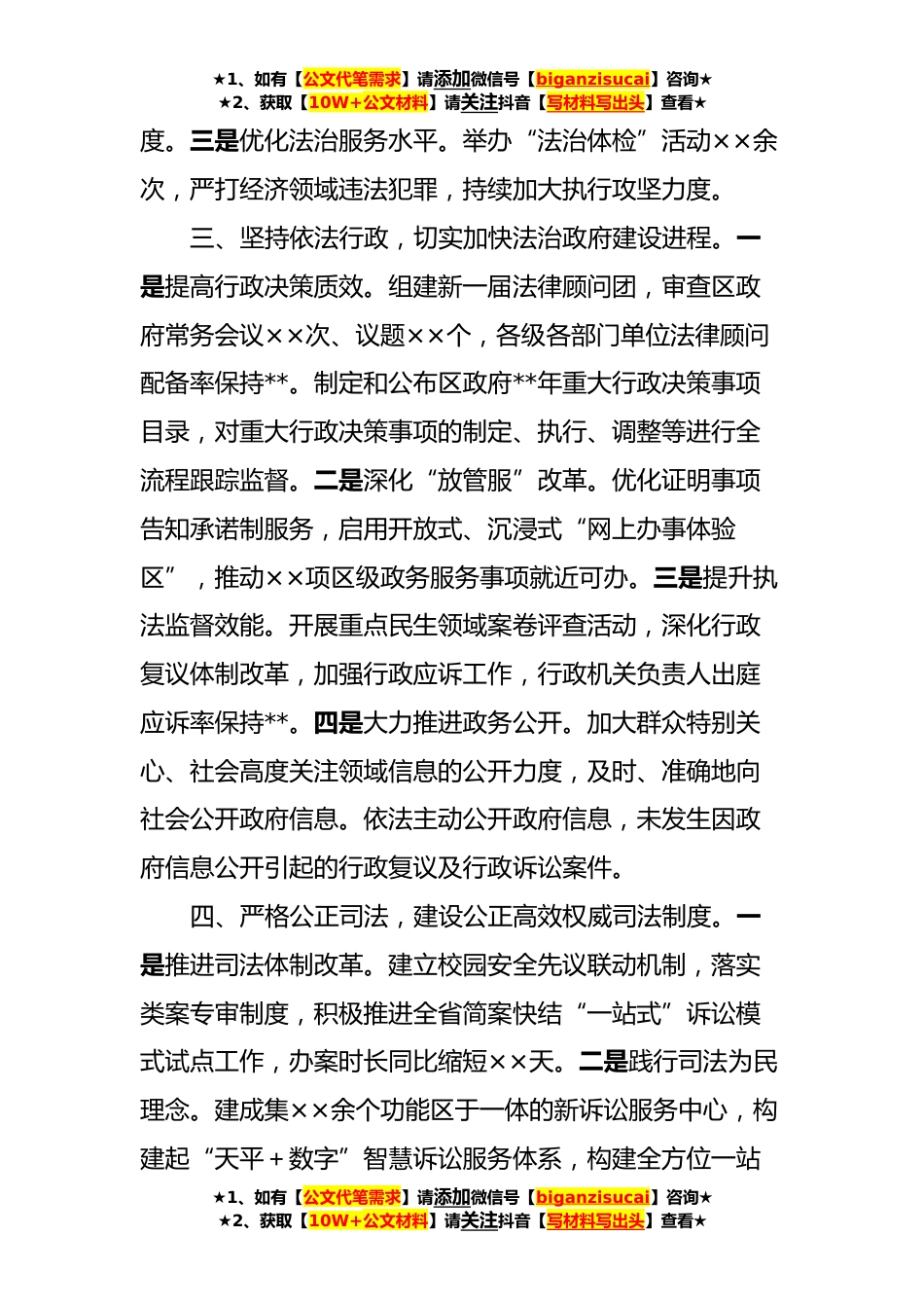 ★1、如有【公文代笔需求】请添加微信号【biganzisucai】咨询★★2、获取【10W+公文材料】请关注抖音【写材料写出头】查看★XX区关于**年法治建设工作情况的报告一、强化党的领导,统筹推进全面依法治区建设。一是强化法治意识。将“法治工作方法”确定为“五种工作方法”之一,树立鲜明的法治工作导向。各级各部门单位学习习近平法治思想××余次,组织干部任前考试××次。组织全区部分国家工作人员法治能力学习和测试。二是压实主体责任。完善常委会议题合法合规性审查机制,将打造良好法治环境纳入区委常委会年度工作要点,听取法治建设工作汇报××次,区委主要负责人对法治工作批示××次,以其他途径参与法治工作××次。区委“一委一办五组”法治机构召开会议××次,制定相关文件××个。三是注重工作实...