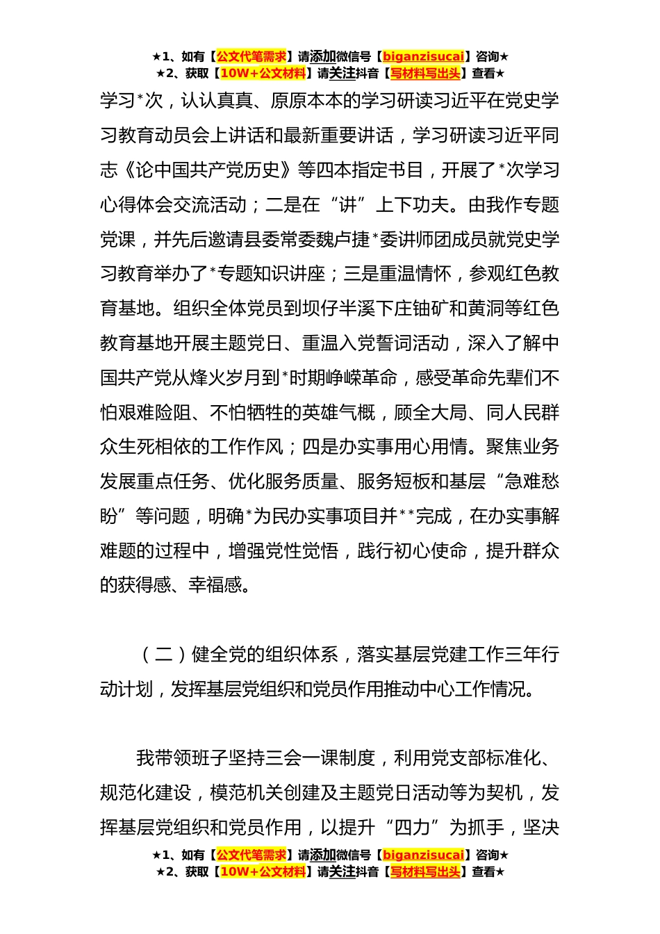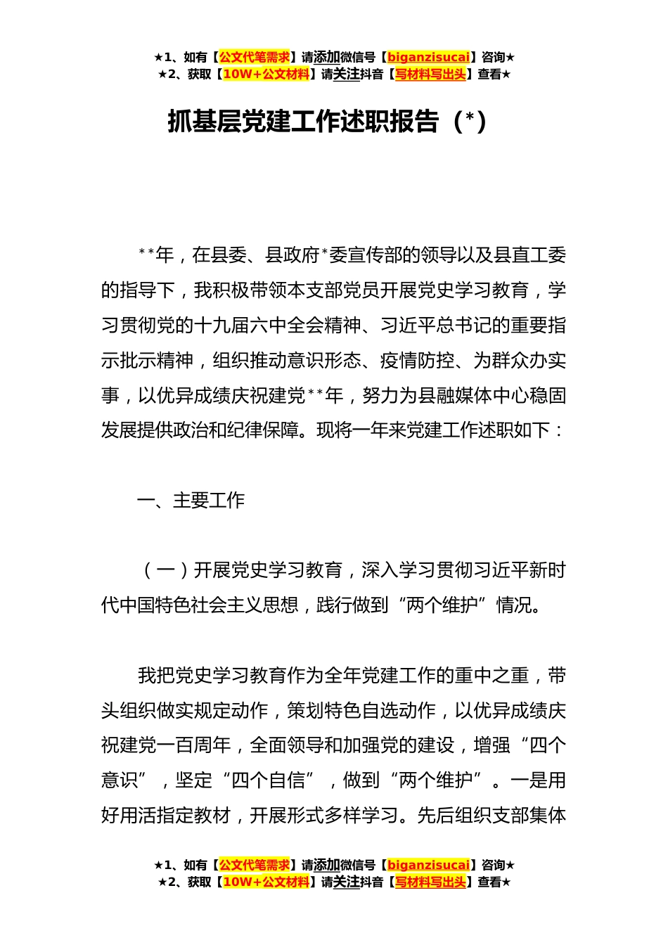 ★1、如有【公文代笔需求】请添加微信号【biganzisucai】咨询★★2、获取【10W+公文材料】请关注抖音【写材料写出头】查看★抓基层党建工作述职报告(*)**年,在县委、县政府*委宣传部的领导以及县直工委的指导下,我积极带领本支部党员开展党史学习教育,学习贯彻党的十九届六中全会精神、习近平总书记的重要指示批示精神,组织推动意识形态、疫情防控、为群众办实事,以优异成绩庆祝建党**年,努力为县融媒体中心稳固发展提供政治和纪律保障。现将一年来党建工作述职如下:一、主要工作(一)开展党史学习教育,深入学习贯彻习近平新时代中国特色社会主义思想,践行做到“两个维护”情况。我把党史学习教育作为全年党建工作的重中之重,带头组织做实规定动作,策划特色自选动作,以优异成绩庆祝建党一百周年,...