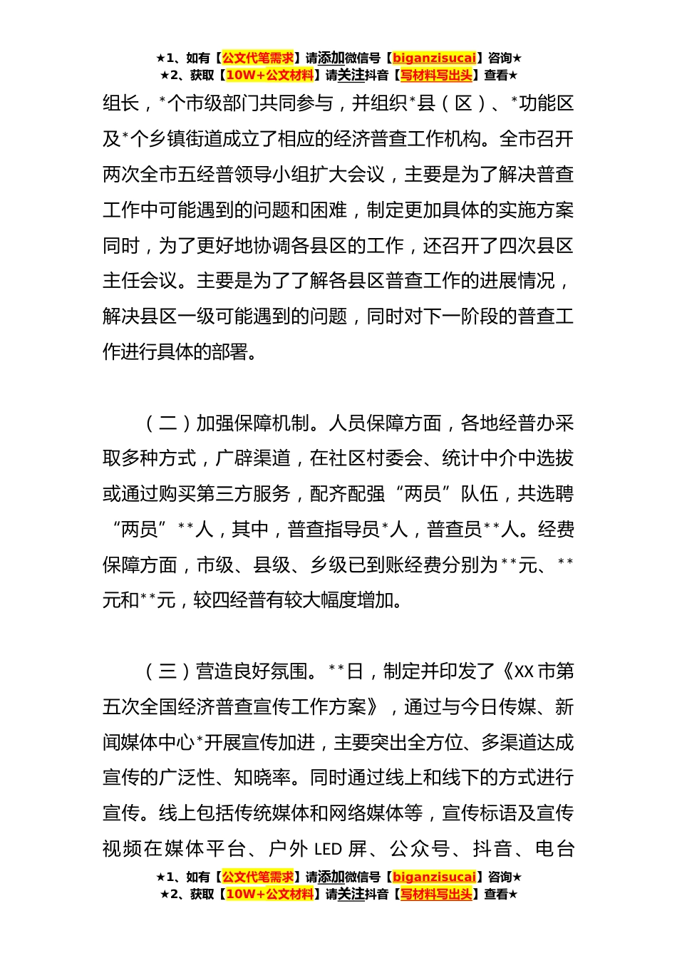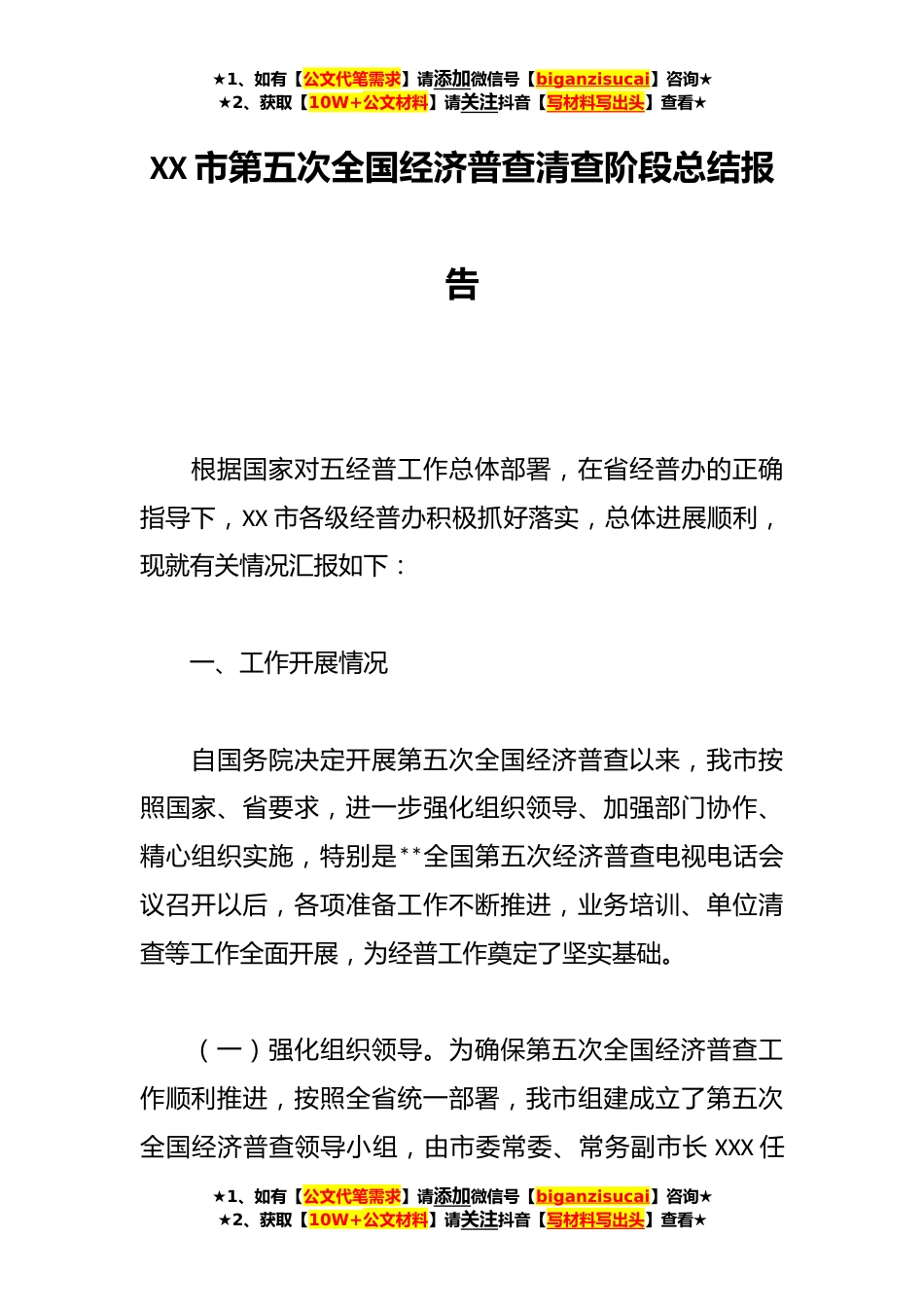 ★1、如有【公文代笔需求】请添加微信号【biganzisucai】咨询★★2、获取【10W+公文材料】请关注抖音【写材料写出头】查看★XX市第五次全国经济普查清查阶段总结报告根据国家对五经普工作总体部署,在省经普办的正确指导下,XX市各级经普办积极抓好落实,总体进展顺利,现就有关情况汇报如下:一、工作开展情况自国务院决定开展第五次全国经济普查以来,我市按照国家、省要求,进一步强化组织领导、加强部门协作、精心组织实施,特别是**全国第五次经济普查电视电话会议召开以后,各项准备工作不断推进,业务培训、单位清查等工作全面开展,为经普工作奠定了坚实基础。(一)强化组织领导。为确保第五次全国经济普查工作顺利推进,按照全省统一部署,我市组建成立了第五次全国经济普查领导小组,由市委常委、常务...