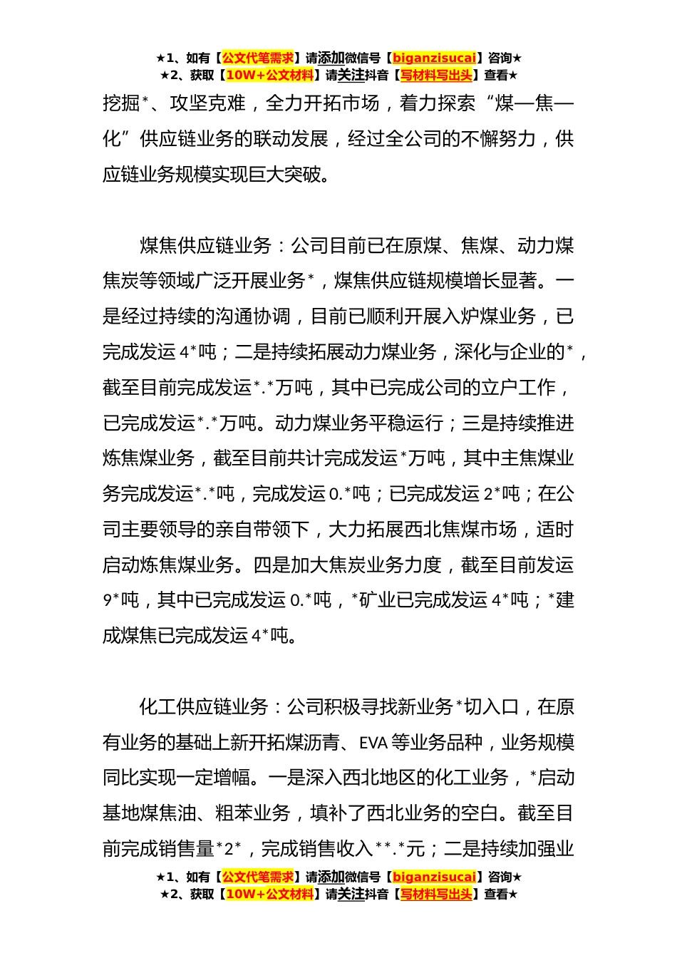 ★1、如有【公文代笔需求】请添加微信号【biganzisucai】咨询★★2、获取【10W+公文材料】请关注抖音【写材料写出头】查看★公司**年工作总结及**年工作计划**年,在集团公司的正确领导下,团结带领全体干部职工,坚持“稳中求进”的工作总基调,踔厉奋发实施集团公司“***发展战略,紧紧围绕年初确定的各项重点工作任务,全公司干部职工团结一心、主动担当作为,坚定实干步伐,砥砺奋进,已顺利实现任务目标。现将公司相关工作情况汇报如下:一、主要经济指标完成情况……二、重点工作推进情况(一)树牢业务导向,提振主业经营今年,公司上下统一树牢业务为王理念,坚持“走出去”和“大客户”战略,坚定不移深耕煤化工供应链领域走访调研了省内外大量市场及客户,通过积极沟通洽谈、★1、如有【公文代笔需求】...