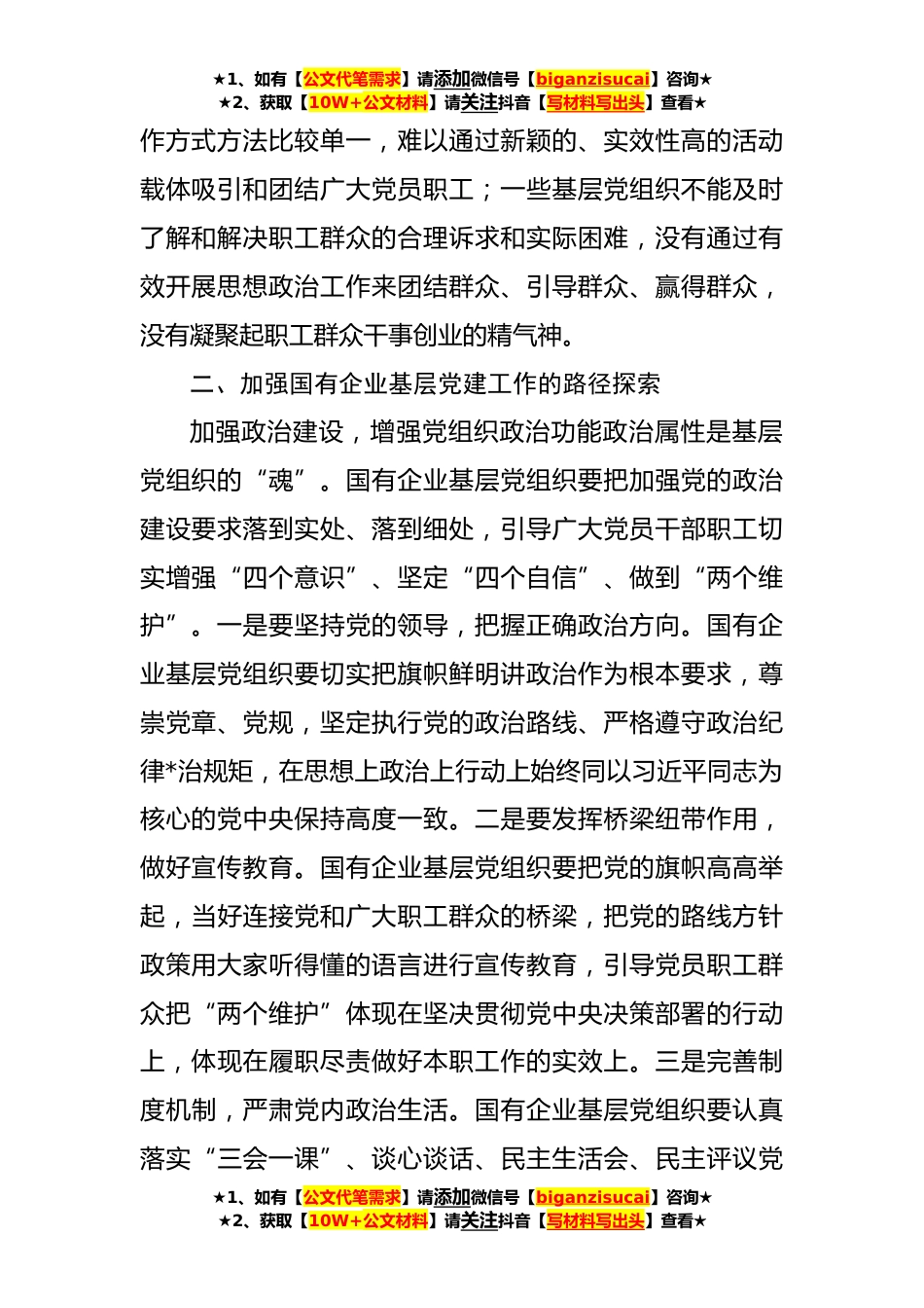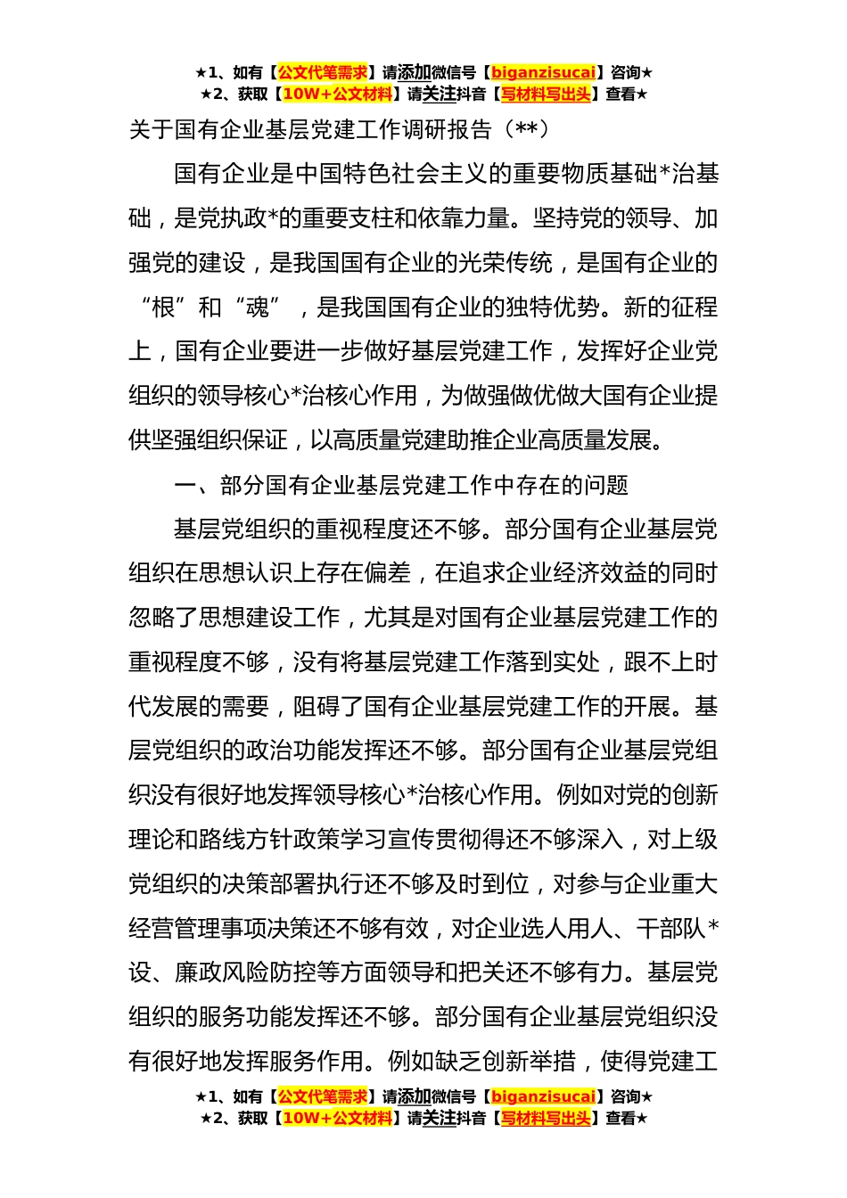 ★1、如有【公文代笔需求】请添加微信号【biganzisucai】咨询★★2、获取【10W+公文材料】请关注抖音【写材料写出头】查看★关于国有企业基层党建工作调研报告(**)国有企业是中国特色社会主义的重要物质基础*治基础,是党执政*的重要支柱和依靠力量。坚持党的领导、加强党的建设,是我国国有企业的光荣传统,是国有企业的“根”和“魂”,是我国国有企业的独特优势。新的征程上,国有企业要进一步做好基层党建工作,发挥好企业党组织的领导核心*治核心作用,为做强做优做大国有企业提供坚强组织保证,以高质量党建助推企业高质量发展。一、部分国有企业基层党建工作中存在的问题基层党组织的重视程度还不够。部分国有企业基层党组织在思想认识上存在偏差,在追求企业经济效益的同时忽略了思想建设工作,尤其是对...