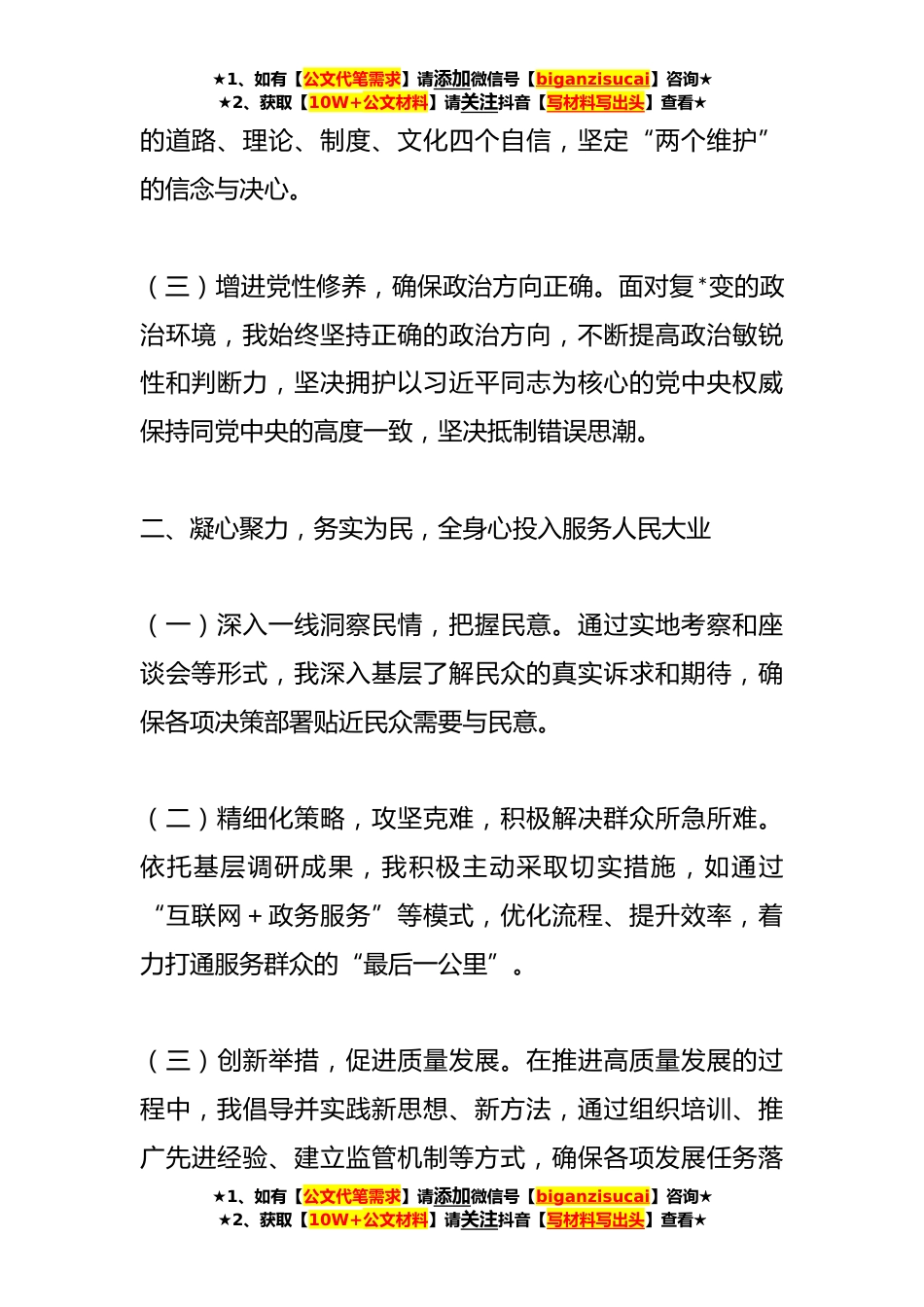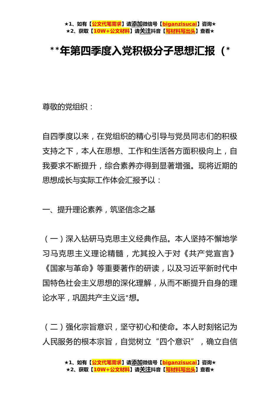 ★1、如有【公文代笔需求】请添加微信号【biganzisucai】咨询★★2、获取【10W+公文材料】请关注抖音【写材料写出头】查看★**年第四季度入党积极分子思想汇报(*尊敬的党组织:自四季度以来,在党组织的精心引导与党员同志们的积极支持之下,本人在思想、工作和生活各方面积极向上,自我要求不断提升,综合素养亦得到显著增强。现将近期的思想成长与实际工作体会汇报予以:一、提升理论素养,筑坚信念之基(一)深入钻研马克思主义经典作品。本人坚持不懈地学习马克思主义理论精髓,尤其投入于对《共产党宣言》《国家与革命》等重要著作的研读,以及习近平新时代中国特色社会主义思想的深化理解,从而不断提升自身的理论水平,巩固共产主义远*想。(二)强化宗旨意识,坚守初心和使命。本人时刻铭记为人民服务的...