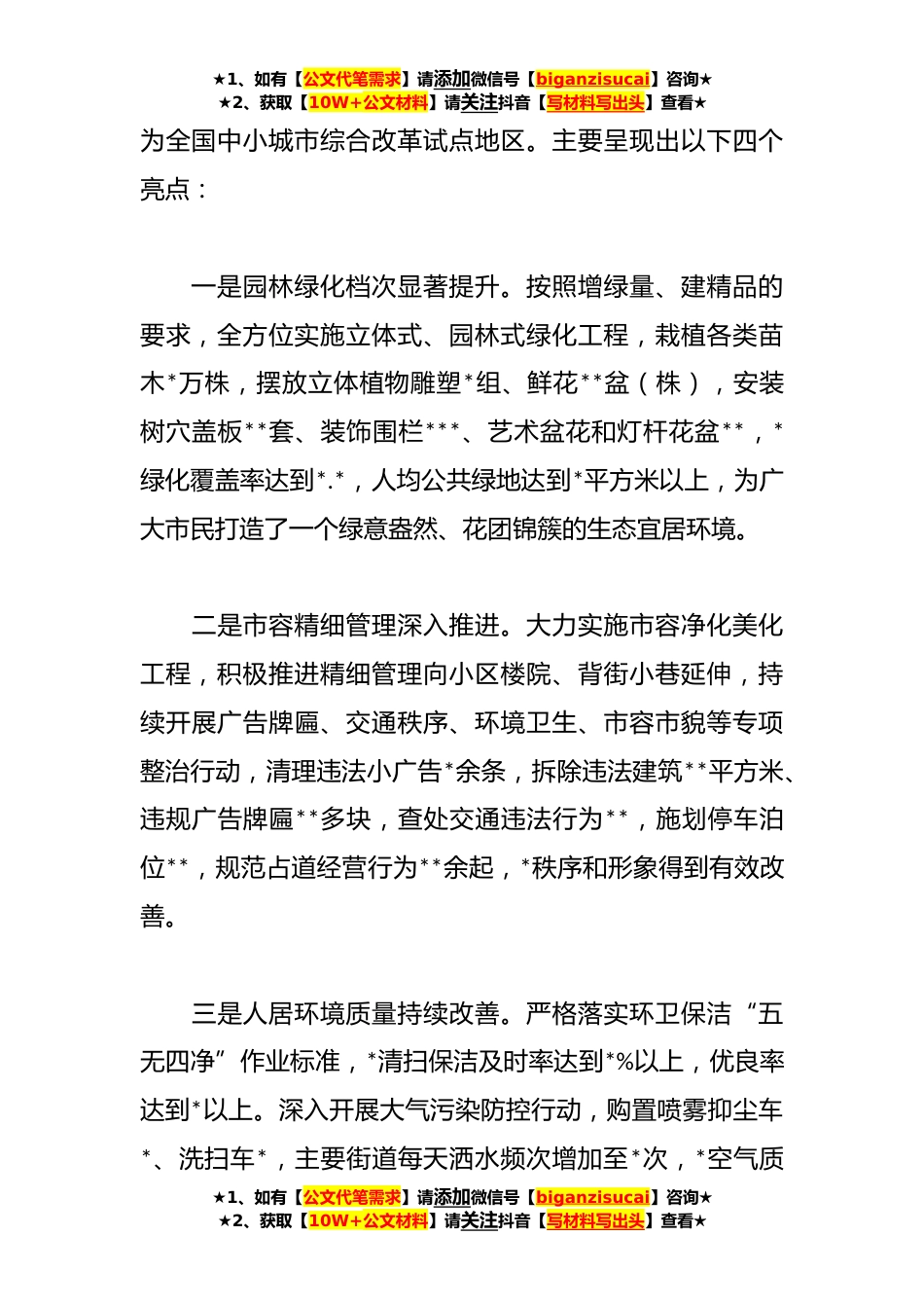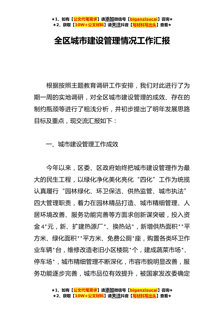 ★1、如有【公文代笔需求】请添加微信号【biganzisucai】咨询★★2、获取【10W+公文材料】请关注抖音【写材料写出头】查看★全区城市建设管理情况工作汇报根据按照主题教育调研工作安排,我们对此进行了为期一周的实地调研,对全区城市建设管理的成效、存在的制约瓶颈等进行了粗浅分析,并初步提出了明年发展思路目标及重点,现交流汇报如下:一、城市建设管理工作成效今年以来,区委、区政府始终把城市建设管理作为最大的民生工程,以绿化净化美化亮化“四化”工作为统揽认真履行“园林绿化、环卫保洁、供热监管、城市执法”四大管理职责,着力在园林精品打造、城市精细管理、人居环境改善、服务功能完善等方面求创新谋突破,投入资金4*元,新、扩建热源厂*、换热站*,新增供热面积**平方米、绿化面积**平方米、...