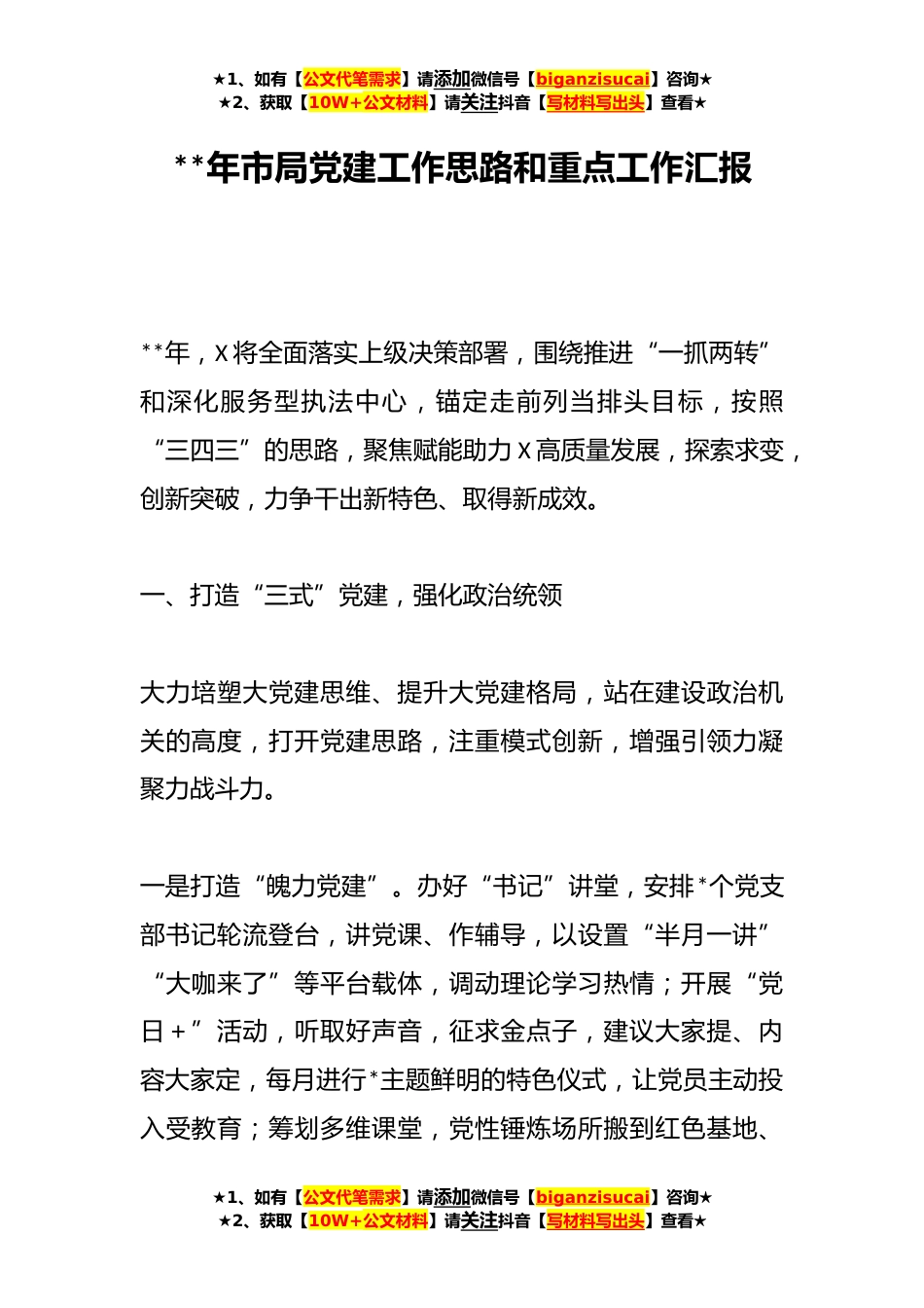 ★1、如有【公文代笔需求】请添加微信号【biganzisucai】咨询★★2、获取【10W+公文材料】请关注抖音【写材料写出头】查看★**年市局党建工作思路和重点工作汇报**年,X将全面落实上级决策部署,围绕推进“一抓两转”和深化服务型执法中心,锚定走前列当排头目标,按照“三四三”的思路,聚焦赋能助力X高质量发展,探索求变,创新突破,力争干出新特色、取得新成效。一、打造“三式”党建,强化政治统领大力培塑大党建思维、提升大党建格局,站在建设政治机关的高度,打开党建思路,注重模式创新,增强引领力凝聚力战斗力。一是打造“魄力党建”。办好“书记”讲堂,安排*个党支部书记轮流登台,讲党课、作辅导,以设置“半月一讲”“大咖来了”等平台载体,调动理论学习热情;开展“党日+”活动,听取好声音,征...