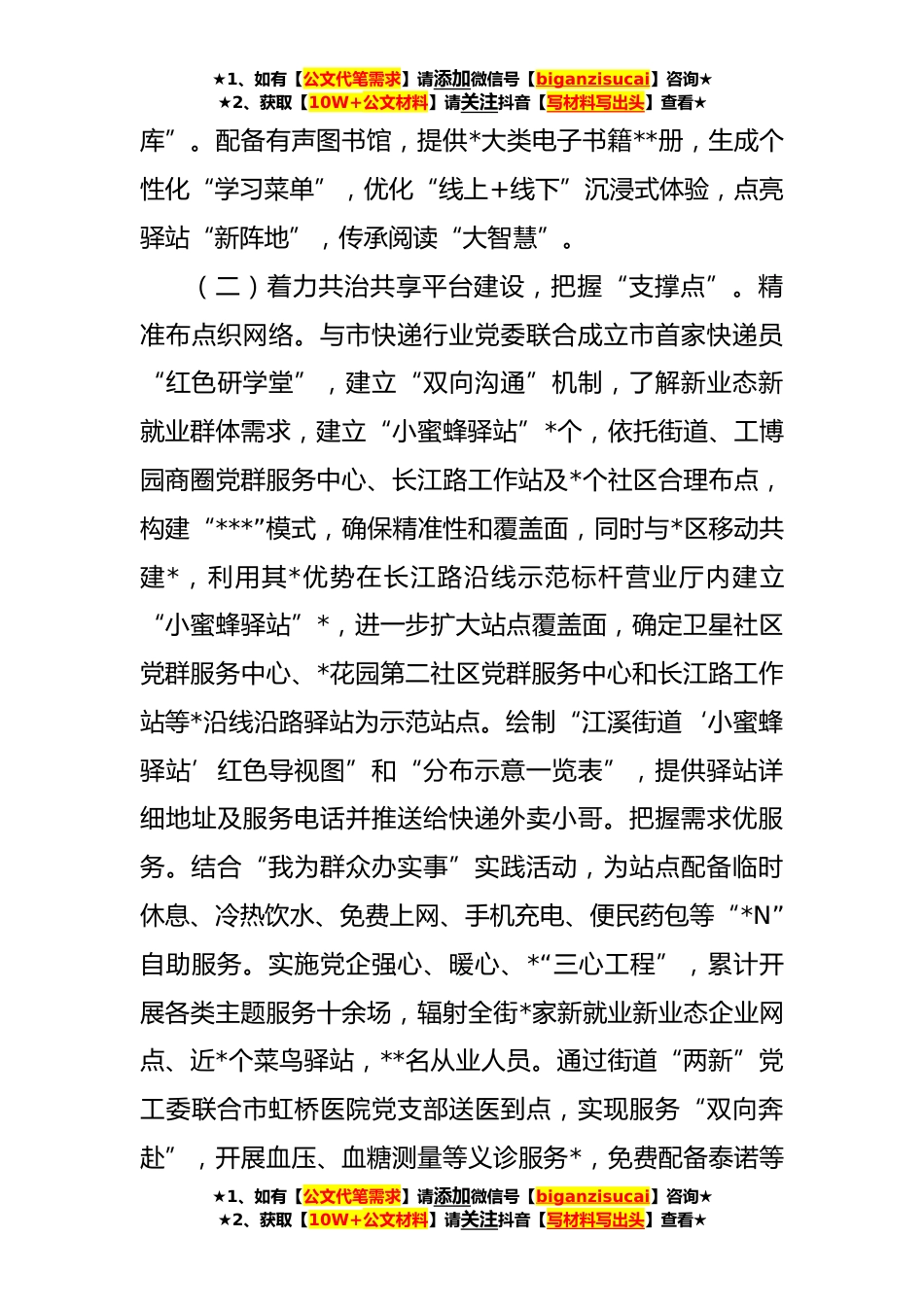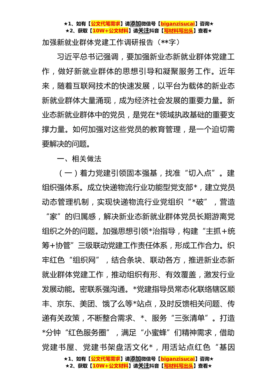 ★1、如有【公文代笔需求】请添加微信号【biganzisucai】咨询★★2、获取【10W+公文材料】请关注抖音【写材料写出头】查看★加强新就业群体党建工作调研报告(**字)习近平总书记强调,要加强新业态新就业群体党建工作,做好新就业群体的思想引导和凝聚服务工作。近年来,随着互联网技术的快速发展,以平台为载体的新业态新就业群体大量涌现,成为经济社会发展的重要力量。新业态新就业群体中的党员,是党在*领域执政基础的重要支撑力量。如何加强对这些党员的教育管理,是一个迫切需要解决的问题。一、相关做法(一)着力党建引领固本强基,找准“切入点”。建组织强体系。成立快递物流行业功能型党支部*,建立党员动态管理机制,实现快递物流行业党组织“*破”,营造“家”的归属感,解决新业态新就业群体党员长...