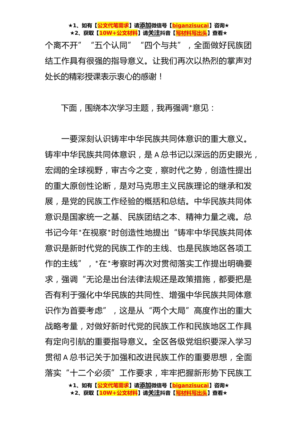 ★1、如有【公文代笔需求】请添加微信号【biganzisucai】咨询★★2、获取【10W+公文材料】请关注抖音【写材料写出头】查看★书记在区委理论中心组学习铸牢中华民族共同体意识方面的讲话同志们:今天我们召开会议,主要任务是深入学习贯彻A总书记关于加强和改进民族工作的重要思想,结合开展主题教育,从深入学习贯彻A新时代中国特色社会主义思想中汲取奋发进取的智慧和力量,在学思践悟中汲取矢志不渝的理想信念、增强担当作为的使命责任、筑牢抵御侵蚀的堤坝防线,努力在以学铸魂、以学增智、以学正风、以学促干等方面取得实实在在的成效。刚才,处长以系统阐述了铸牢中华民族共同体意识的科学内涵和重大意义,生动讲述了在中国共产党的领导下取得的巨大成就和发生的显著变化,内容主题鲜明、深入浅出、事例鲜活...