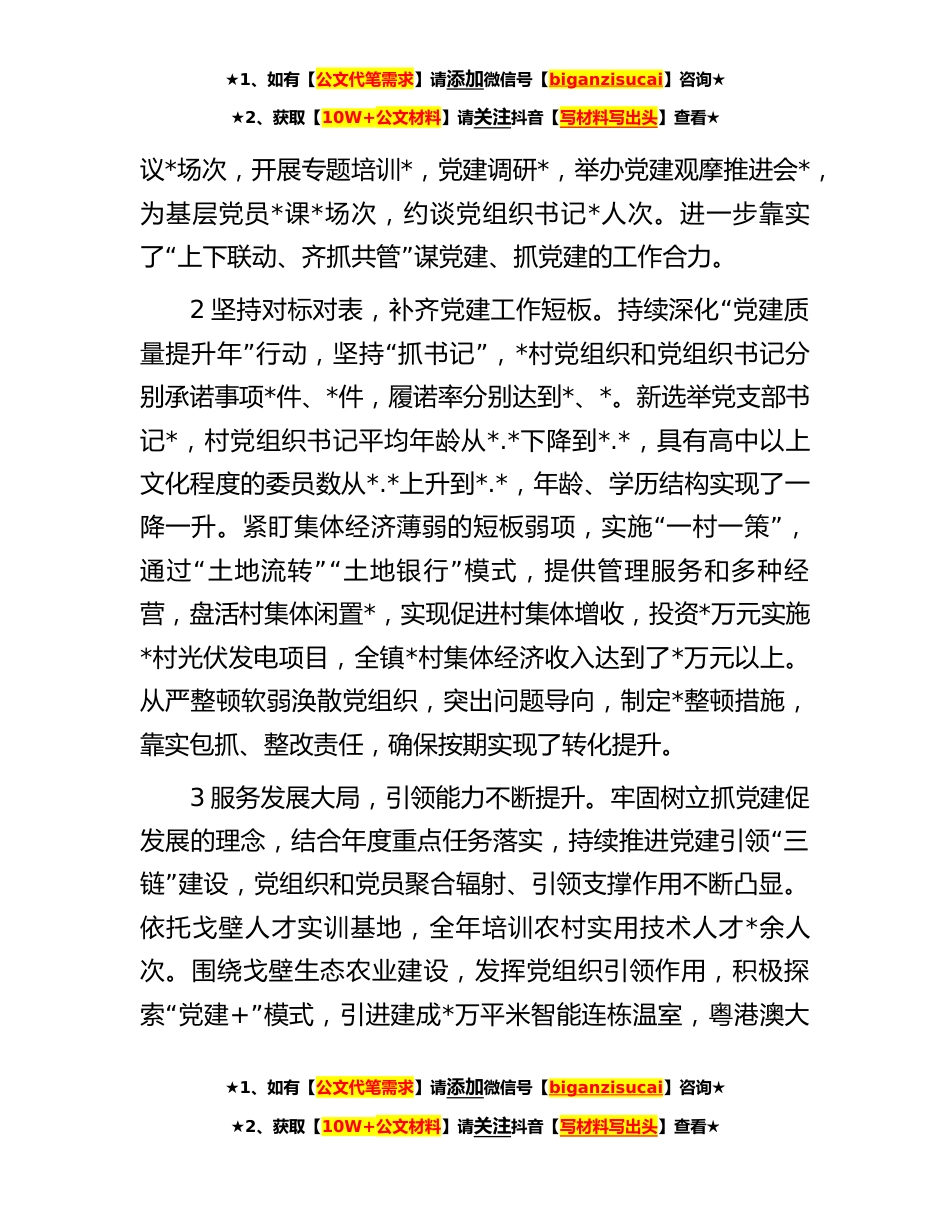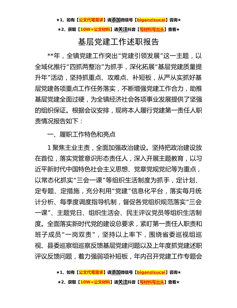 ★1、如有【公文代笔需求】请添加微信号【biganzisucai】咨询★★2、获取【10W+公文材料】请关注抖音【写材料写出头】查看★基层党建工作述职报告**“”年,全镇党建工作突出党建引领发展这一主题,以“”“全域化推行四抓两整治为抓手,深化拓展基层党建质量提”升年活动,坚持抓重点、攻难点、补短板,从严从实抓好基层党建各项重点工作任务落实,不断增强党建工作合力,助推基层党建全面过硬,为全镇经济社会各项事业发展提供了坚强的组织保证。根据会议安排,现将本人履行党建第一责任人职责情况报告如下:一、履职工作特色和亮点1聚焦主业主责,全面加强政治建设。坚持把政治建设放在首位,落实党管意识形态责任人,深入开展主题教育,以习近平新时代中国特色社会主义思想、党章党规党纪等为重点,“”以常态...
