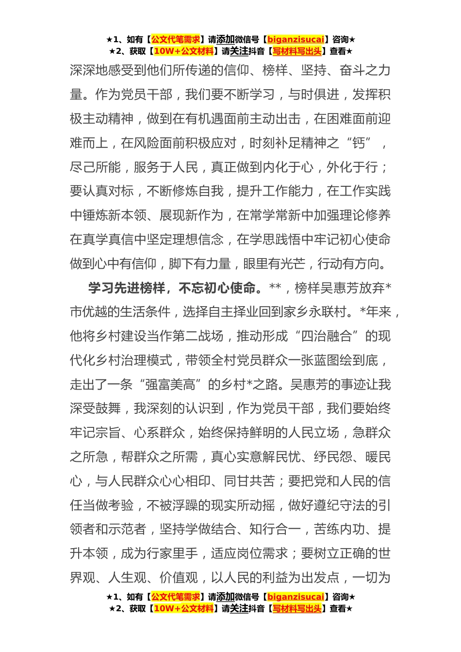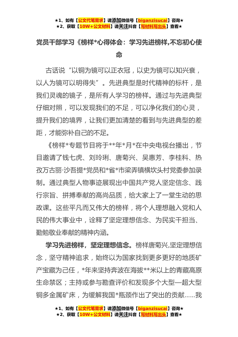 ★1、如有【公文代笔需求】请添加微信号【biganzisucai】咨询★★2、获取【10W+公文材料】请关注抖音【写材料写出头】查看★党员干部学习《榜样*心得体会:学习先进榜样,不忘初心使命古话说“以铜为镜可以正衣冠,以史为镜可以知兴衰,以人为镜可以明得失”。先进典型是时代精神的标杆,是我们灵魂的镜子,是所有人学习的榜样。通过与先进典型仔细对照,可以发现我们的不足,可以净化我们的心灵,提升我们的境界,让我们更加清楚的看到与先进典型的差距,才能弥补自己的不足。《榜样*专题节目将于**年*月*在中央电视台播出,节目邀请了钱七虎、刘玲琍、唐菊兴、吴惠芳、李桂科、热孜万古丽·沙吾提*党员和*省*市梁弄镇横坎头村党委参加录制。通过典型人物事迹展现出中国共产党人坚定信念、践行宗旨、拼搏奉献的高...