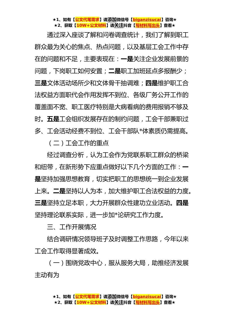 ★1、如有【公文代笔需求】请添加微信号【biganzisucai】咨询★★2、获取【10W+公文材料】请关注抖音【写材料写出头】查看★“落实五大任务、推动高质量发展”调研成果交流研讨材料主题教育开展以来,我们深入落实“学思想、强党性、重实践、建新功”的总要求,将学习贯彻习近平总书记教育重要论述与学习贯彻习近平总书记考察*时的重要指示重要讲话精神结合起来,将贯彻落实习近平总书记交给*的“五大任务”与推动工会中心工作结合起来,为了进一步探讨新形势下的工会,探索企业构建劳动和谐关系的思路、方法和途径,加强新形势下的工会工作,于**年*至*开展以新形势下工会工作的探索与思考为题的调研,现就本次调研成果和大家分享交流。一、调研方式方法本次调研采取网络问卷调查、交流座谈、实地走访等形式,重...