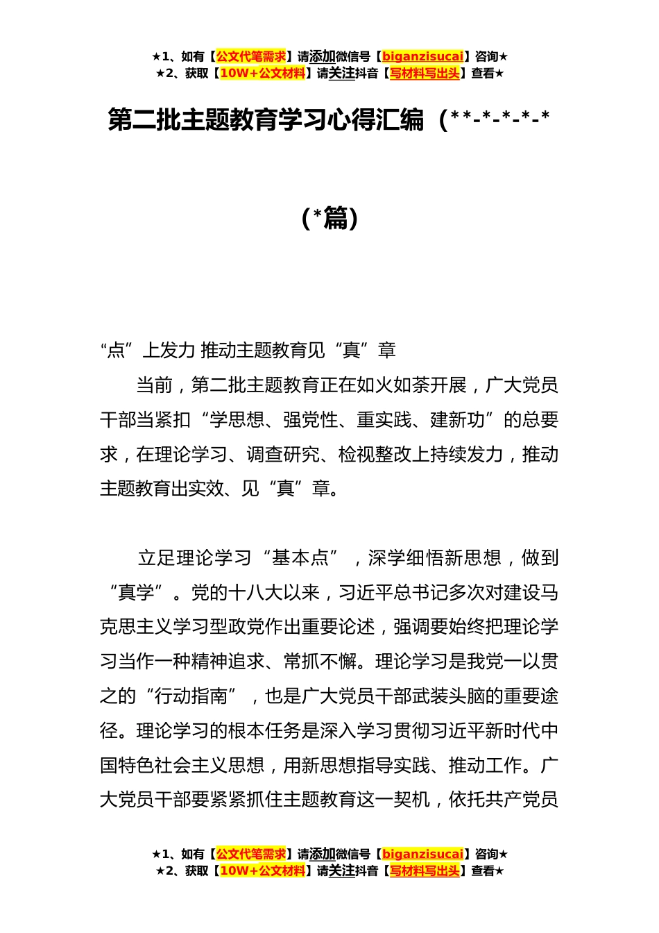 ★1、如有【公文代笔需求】请添加微信号【biganzisucai】咨询★★2、获取【10W+公文材料】请关注抖音【写材料写出头】查看★第二批主题教育学习心得汇编(**-*-*-*-*(*篇)“点”上发力推动主题教育见“真”章当前,第二批主题教育正在如火如荼开展,广大党员干部当紧扣“学思想、强党性、重实践、建新功”的总要求,在理论学习、调查研究、检视整改上持续发力,推动主题教育出实效、见“真”章。立足理论学习“基本点”,深学细悟新思想,做到“真学”。党的十八大以来,习近平总书记多次对建设马克思主义学习型政党作出重要论述,强调要始终把理论学习当作一种精神追求、常抓不懈。理论学习是我党一以贯之的“行动指南”,也是广大党员干部武装头脑的重要途径。理论学习的根本任务是深入学习贯彻习近平新时代中...