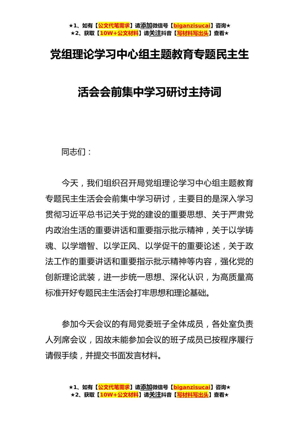 ★1、如有【公文代笔需求】请添加微信号【biganzisucai】咨询★★2、获取【10W+公文材料】请关注抖音【写材料写出头】查看★党组理论学习中心组主题教育专题民主生活会会前集中学习研讨主持词同志们:今天,我们组织召开局党组理论学习中心组主题教育专题民主生活会会前集中学习研讨,主要目的是深入学习贯彻习近平总书记关于党的建设的重要思想、关于严肃党内政治生活的重要讲话和重要指示批示精神,关于以学铸魂、以学增智、以学正风、以学促干的重要论述,关于政法工作的重要讲话和重要指示批示精神等内容,强化党的创新理论武装,进一步统一思想、深化认识,为高质量高标准开好专题民主生活会打牢思想和理论基础。参加今天会议的有局党委班子全体成员,各处室负责人列席会议,因故未能参加会议的班子成员已按...