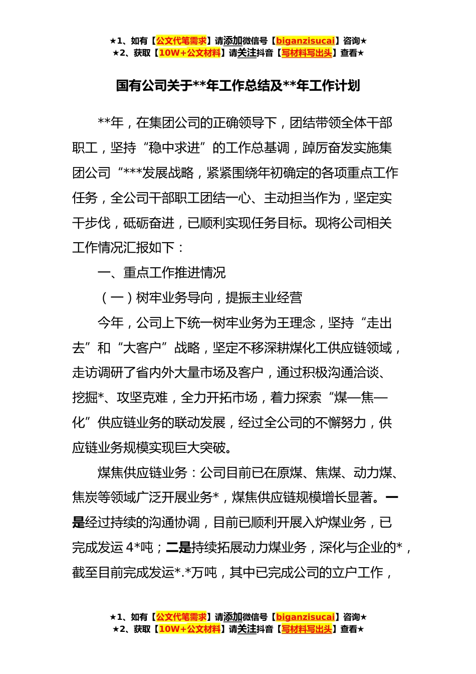 ★1、如有【公文代笔需求】请添加微信号【biganzisucai】咨询★★2、获取【10W+公文材料】请关注抖音【写材料写出头】查看★国有公司关于**年工作总结及**年工作计划**年,在集团公司的正确领导下,团结带领全体干部职工,坚持“稳中求进”的工作总基调,踔厉奋发实施集团公司“***发展战略,紧紧围绕年初确定的各项重点工作任务,全公司干部职工团结一心、主动担当作为,坚定实干步伐,砥砺奋进,已顺利实现任务目标。现将公司相关工作情况汇报如下:一、重点工作推进情况(一)树牢业务导向,提振主业经营今年,公司上下统一树牢业务为王理念,坚持“走出去”和“大客户”战略,坚定不移深耕煤化工供应链领域,走访调研了省内外大量市场及客户,通过积极沟通洽谈、挖掘*、攻坚克难,全力开拓市场,着力探索“煤...