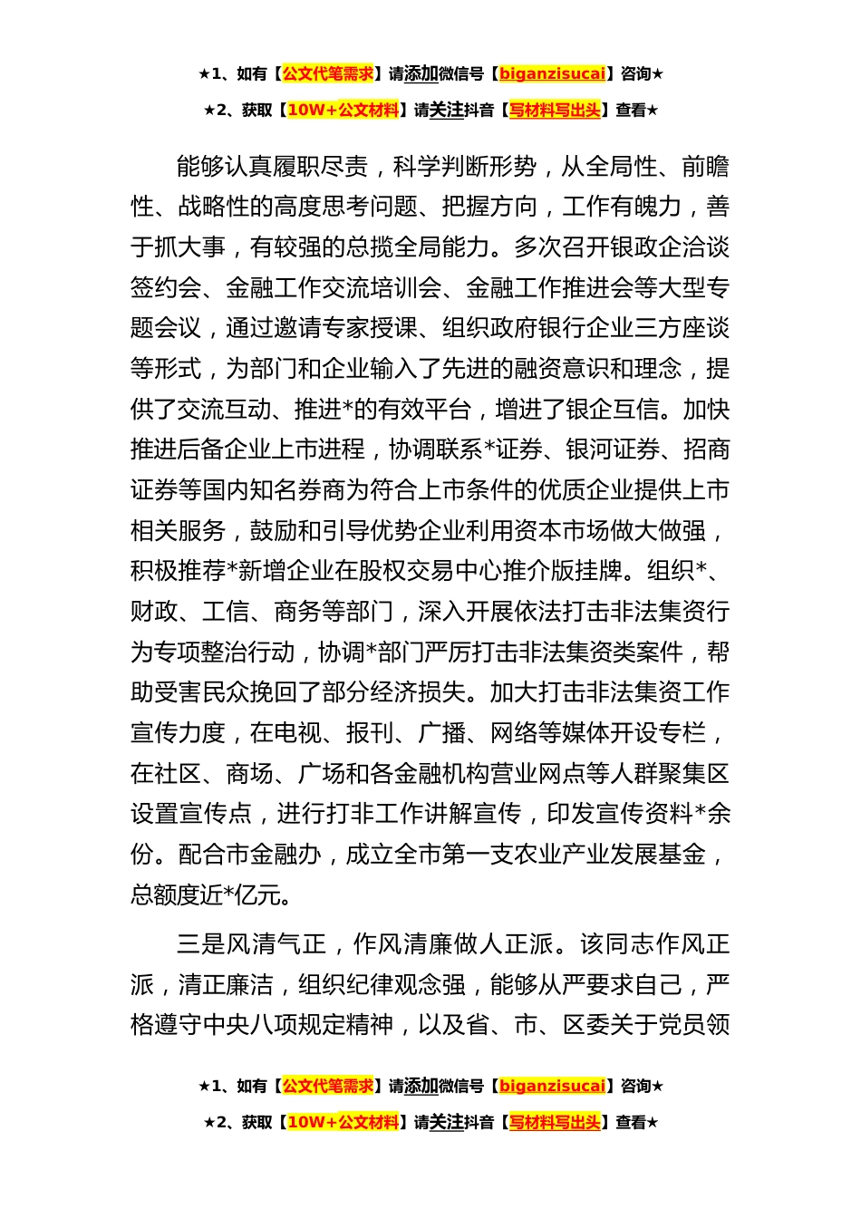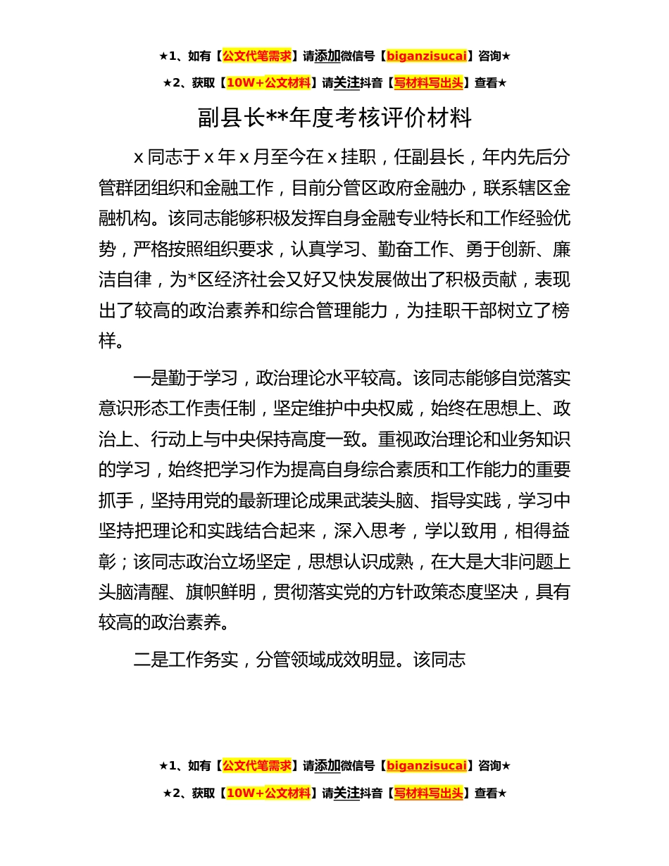★1、如有【公文代笔需求】请添加微信号【biganzisucai】咨询★★2、获取【10W+公文材料】请关注抖音【写材料写出头】查看★副县长**年度考核评价材料x同志于x年x月至今在x挂职,任副县长,年内先后分管群团组织和金融工作,目前分管区政府金融办,联系辖区金融机构。该同志能够积极发挥自身金融专业特长和工作经验优势,严格按照组织要求,认真学习、勤奋工作、勇于创新、廉洁自律,为*区经济社会又好又快发展做出了积极贡献,表现出了较高的政治素养和综合管理能力,为挂职干部树立了榜样。一是勤于学习,政治理论水平较高。该同志能够自觉落实意识形态工作责任制,坚定维护中央权威,始终在思想上、政治上、行动上与中央保持高度一致。重视政治理论和业务知识的学习,始终把学习作为提高自身综合素质和工作能力...