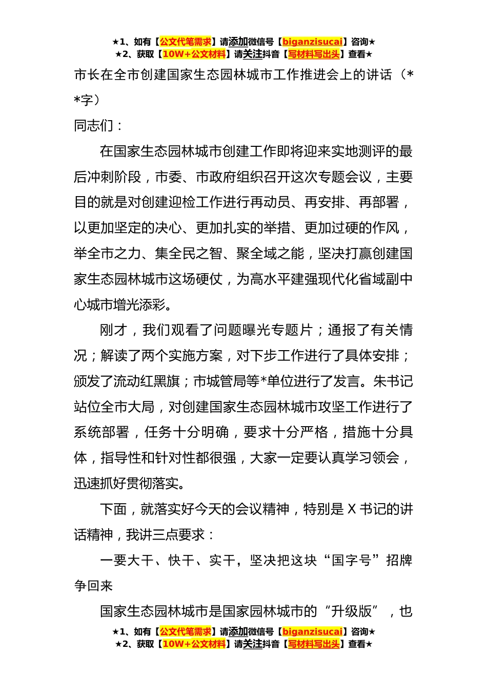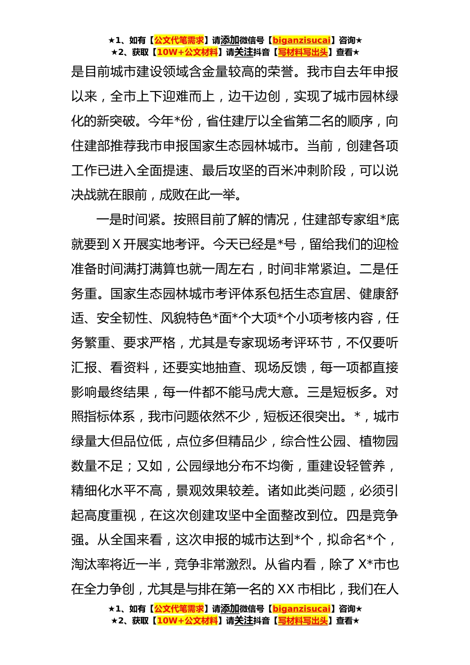 ★1、如有【公文代笔需求】请添加微信号【biganzisucai】咨询★★2、获取【10W+公文材料】请关注抖音【写材料写出头】查看★市长在全市创建国家生态园林城市工作推进会上的讲话(**字)同志们:在国家生态园林城市创建工作即将迎来实地测评的最后冲刺阶段,市委、市政府组织召开这次专题会议,主要目的就是对创建迎检工作进行再动员、再安排、再部署,以更加坚定的决心、更加扎实的举措、更加过硬的作风,举全市之力、集全民之智、聚全域之能,坚决打赢创建国家生态园林城市这场硬仗,为高水平建强现代化省域副中心城市增光添彩。刚才,我们观看了问题曝光专题片;通报了有关情况;解读了两个实施方案,对下步工作进行了具体安排;颁发了流动红黑旗;市城管局等*单位进行了发言。朱书记站位全市大局,对创建国家生...