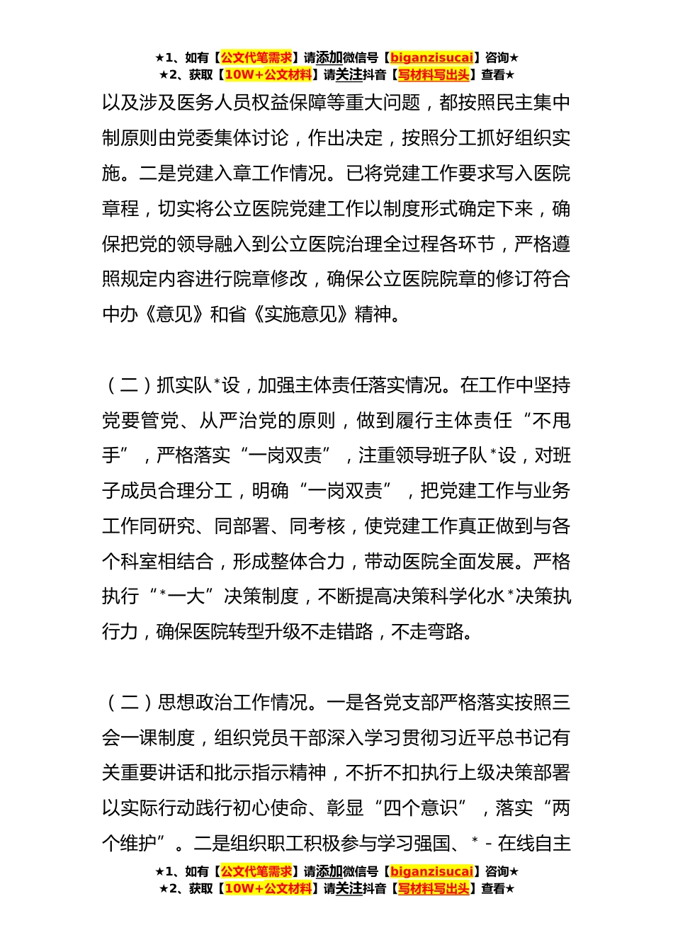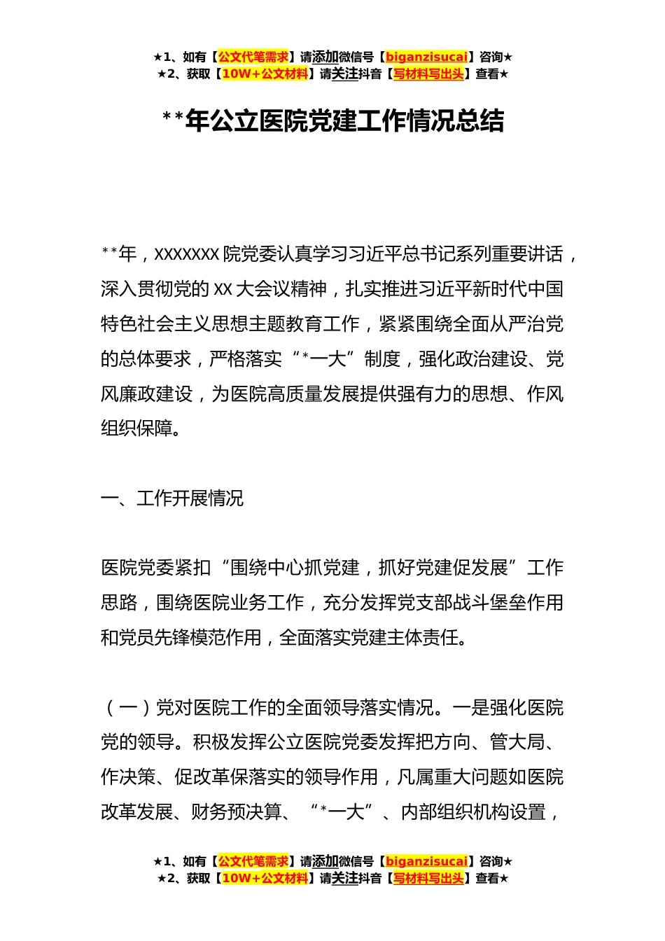 ★1、如有【公文代笔需求】请添加微信号【biganzisucai】咨询★★2、获取【10W+公文材料】请关注抖音【写材料写出头】查看★**年公立医院党建工作情况总结**年,XXXXXXX院党委认真学习习近平总书记系列重要讲话,深入贯彻党的XX大会议精神,扎实推进习近平新时代中国特色社会主义思想主题教育工作,紧紧围绕全面从严治党的总体要求,严格落实“*一大”制度,强化政治建设、党风廉政建设,为医院高质量发展提供强有力的思想、作风组织保障。一、工作开展情况医院党委紧扣“围绕中心抓党建,抓好党建促发展”工作思路,围绕医院业务工作,充分发挥党支部战斗堡垒作用和党员先锋模范作用,全面落实党建主体责任。(一)党对医院工作的全面领导落实情况。一是强化医院党的领导。积极发挥公立医院党委发挥把方向、管大...