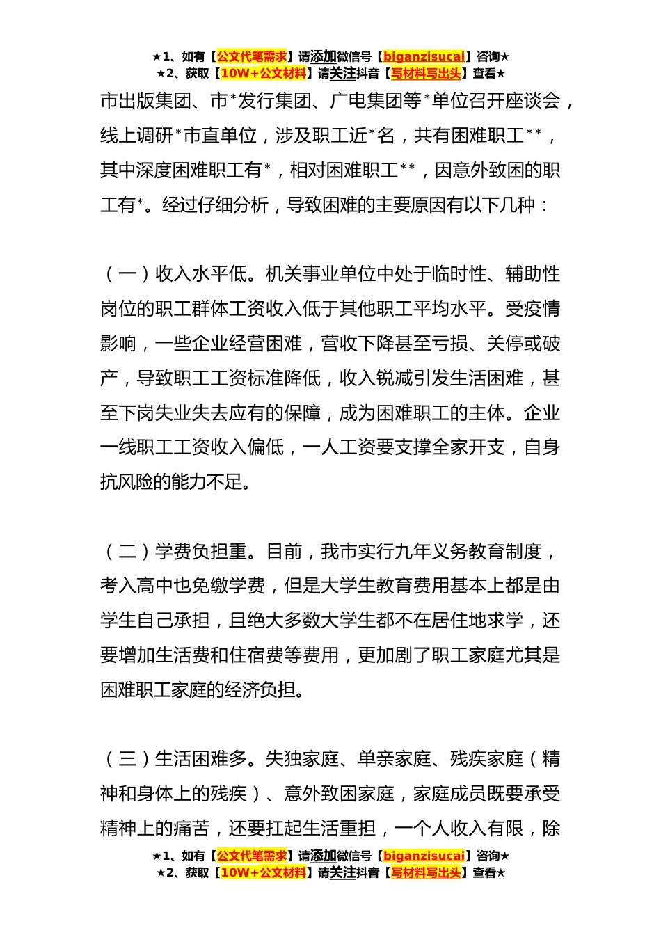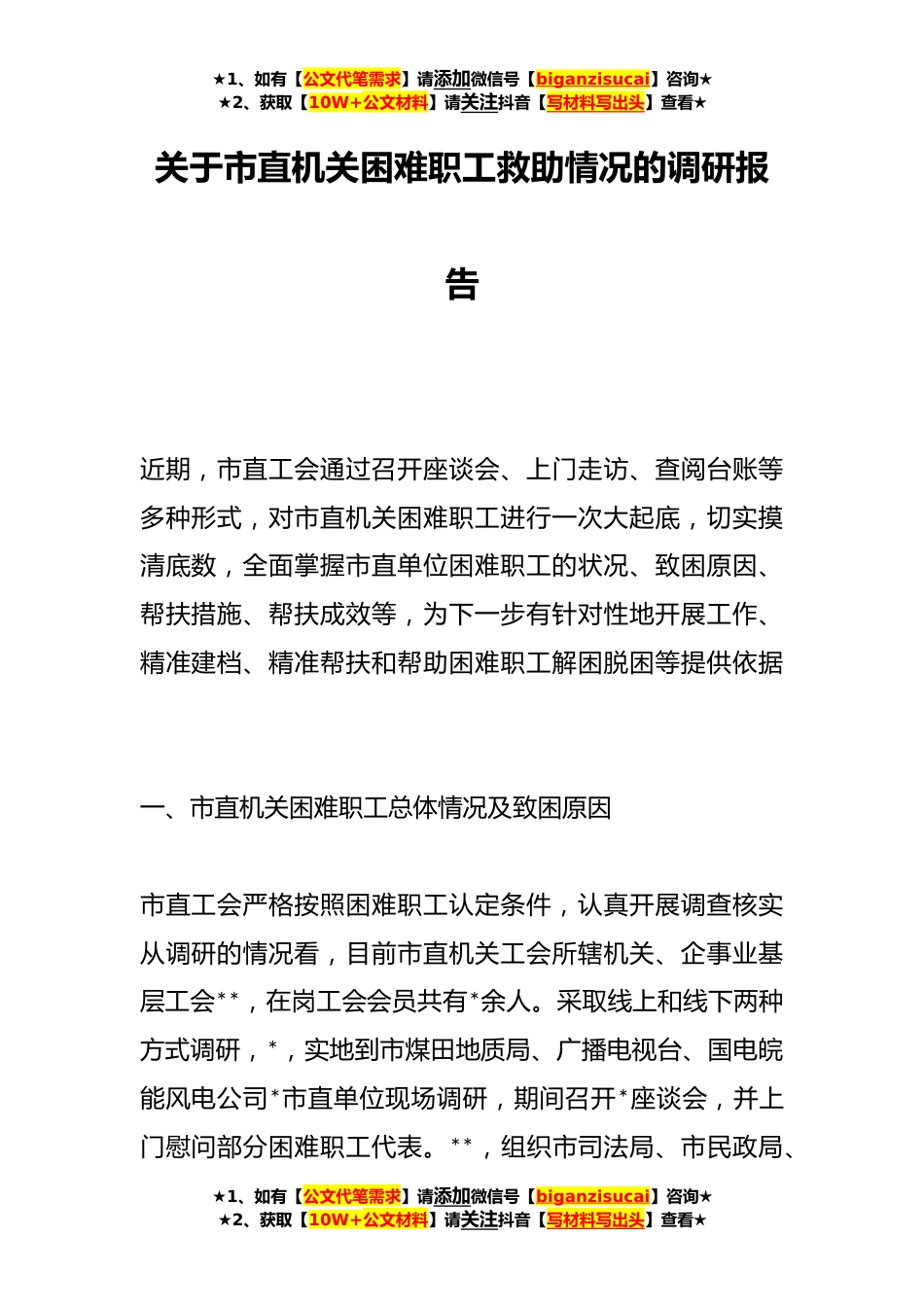 ★1、如有【公文代笔需求】请添加微信号【biganzisucai】咨询★★2、获取【10W+公文材料】请关注抖音【写材料写出头】查看★关于市直机关困难职工救助情况的调研报告近期,市直工会通过召开座谈会、上门走访、查阅台账等多种形式,对市直机关困难职工进行一次大起底,切实摸清底数,全面掌握市直单位困难职工的状况、致困原因、帮扶措施、帮扶成效等,为下一步有针对性地开展工作、精准建档、精准帮扶和帮助困难职工解困脱困等提供依据一、市直机关困难职工总体情况及致困原因市直工会严格按照困难职工认定条件,认真开展调查核实从调研的情况看,目前市直机关工会所辖机关、企事业基层工会**,在岗工会会员共有*余人。采取线上和线下两种方式调研,*,实地到市煤田地质局、广播电视台、国电皖能风电公司*市直单位...