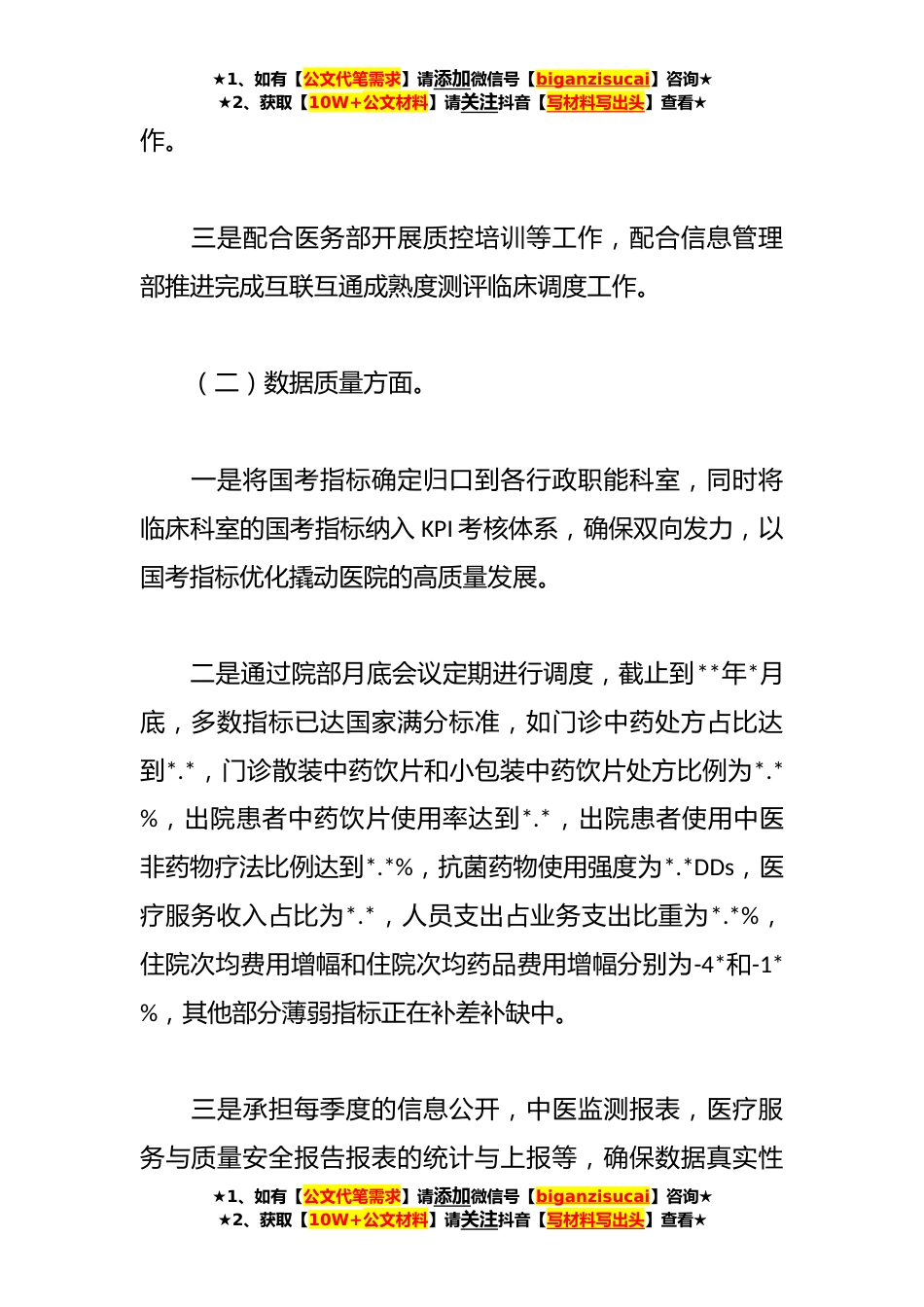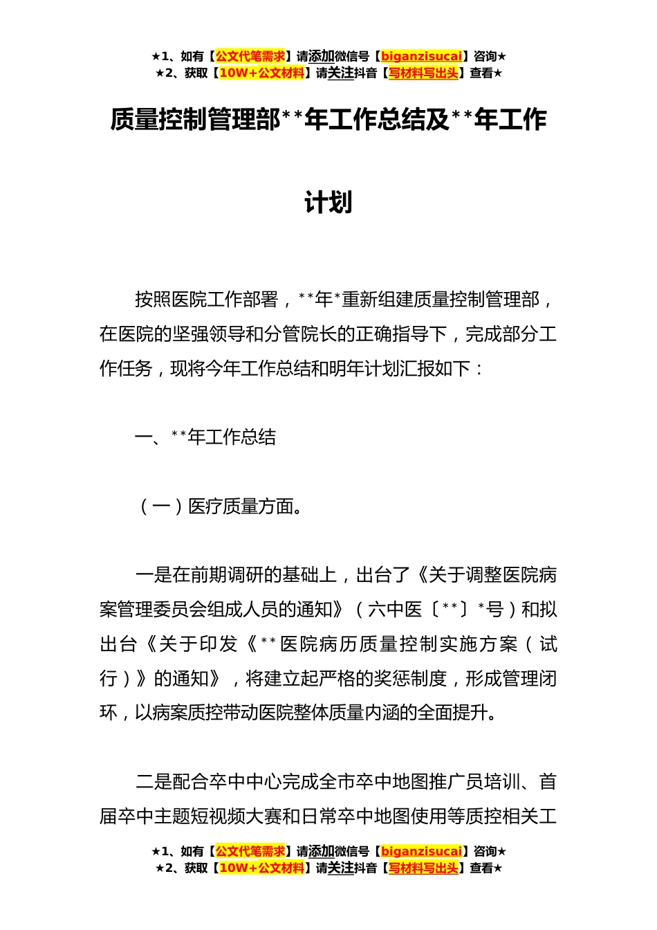 ★1、如有【公文代笔需求】请添加微信号【biganzisucai】咨询★★2、获取【10W+公文材料】请关注抖音【写材料写出头】查看★质量控制管理部**年工作总结及**年工作计划按照医院工作部署,**年*重新组建质量控制管理部,在医院的坚强领导和分管院长的正确指导下,完成部分工作任务,现将今年工作总结和明年计划汇报如下:一、**年工作总结(一)医疗质量方面。一是在前期调研的基础上,出台了《关于调整医院病案管理委员会组成人员的通知》(六中医〔**〕*号)和拟出台《关于印发《**医院病历质量控制实施方案(试行)》的通知》,将建立起严格的奖惩制度,形成管理闭环,以病案质控带动医院整体质量内涵的全面提升。二是配合卒中中心完成全市卒中地图推广员培训、首届卒中主题短视频大赛和日常卒中地图使用等质控...