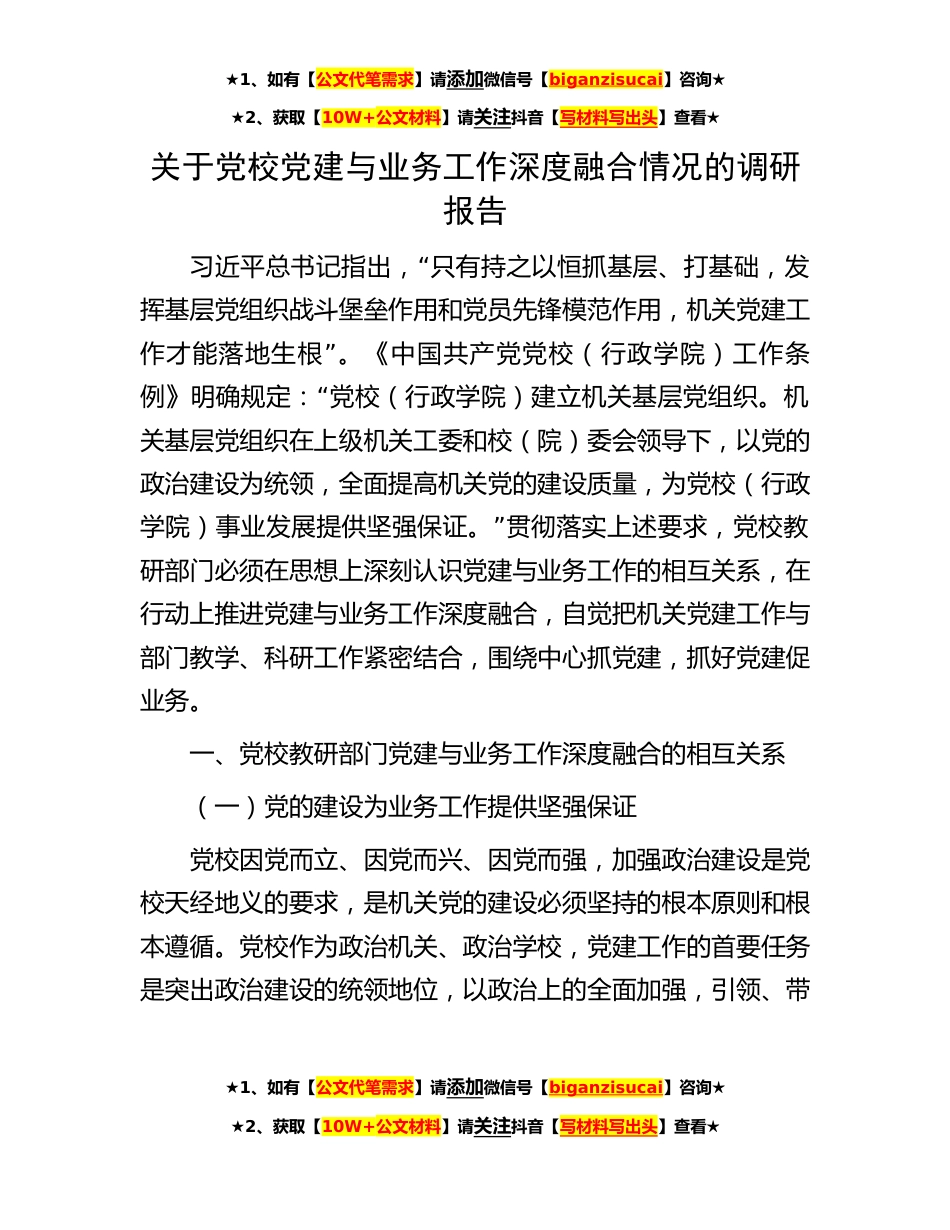 ★1、如有【公文代笔需求】请添加微信号【biganzisucai】咨询★★2、获取【10W+公文材料】请关注抖音【写材料写出头】查看★关于党校党建与业务工作深度融合情况的调研报告“习近平总书记指出,只有持之以恒抓基层、打基础,发挥基层党组织战斗堡垒作用和党员先锋模范作用,机关党建工”作才能落地生根。《中国共产党党校(行政学院)工作条“例》明确规定:党校(行政学院)建立机关基层党组织。机关基层党组织在上级机关工委和校(院)委会领导下,以党的政治建设为统领,全面提高机关党的建设质量,为党校(行政”学院)事业发展提供坚强保证。贯彻落实上述要求,党校教研部门必须在思想上深刻认识党建与业务工作的相互关系,在行动上推进党建与业务工作深度融合,自觉把机关党建工作与部门教学、科研工作紧密...