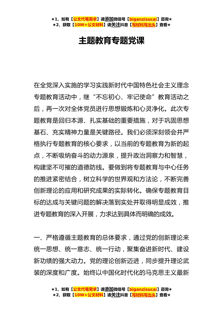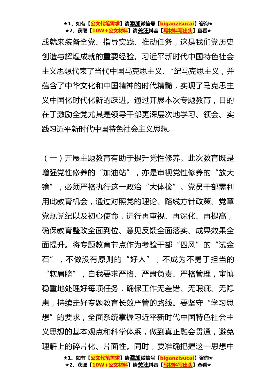 ★1、如有【公文代笔需求】请添加微信号【biganzisucai】咨询★★2、获取【10W+公文材料】请关注抖音【写材料写出头】查看★主题教育专题党课在全党深入实施的学习实践新时代中国特色社会主义理念专题教育活动中,继“不忘初心、牢记使命”教育活动之后,再一次对全体党员进行思想锻炼和心灵净化。此次专题教育是回归本源、扎实基础的重要措施,对于巩固思想基石、充实精神力量是关键路径。我们必须深刻领会并严格执行专题教育的核心要求,以当前的专题教育为新的起点,不断吸纳奋斗的动力源泉,提升政治洞察力和智慧,构建坚不可摧的道德防线。要做到将专题教育与中心任务的推进紧密结合,树立科学的世界观和方法论,不断完善创新理论的应用和研究成果的实际转化。确保专题教育目标的达成与关键问题的解决落到实...