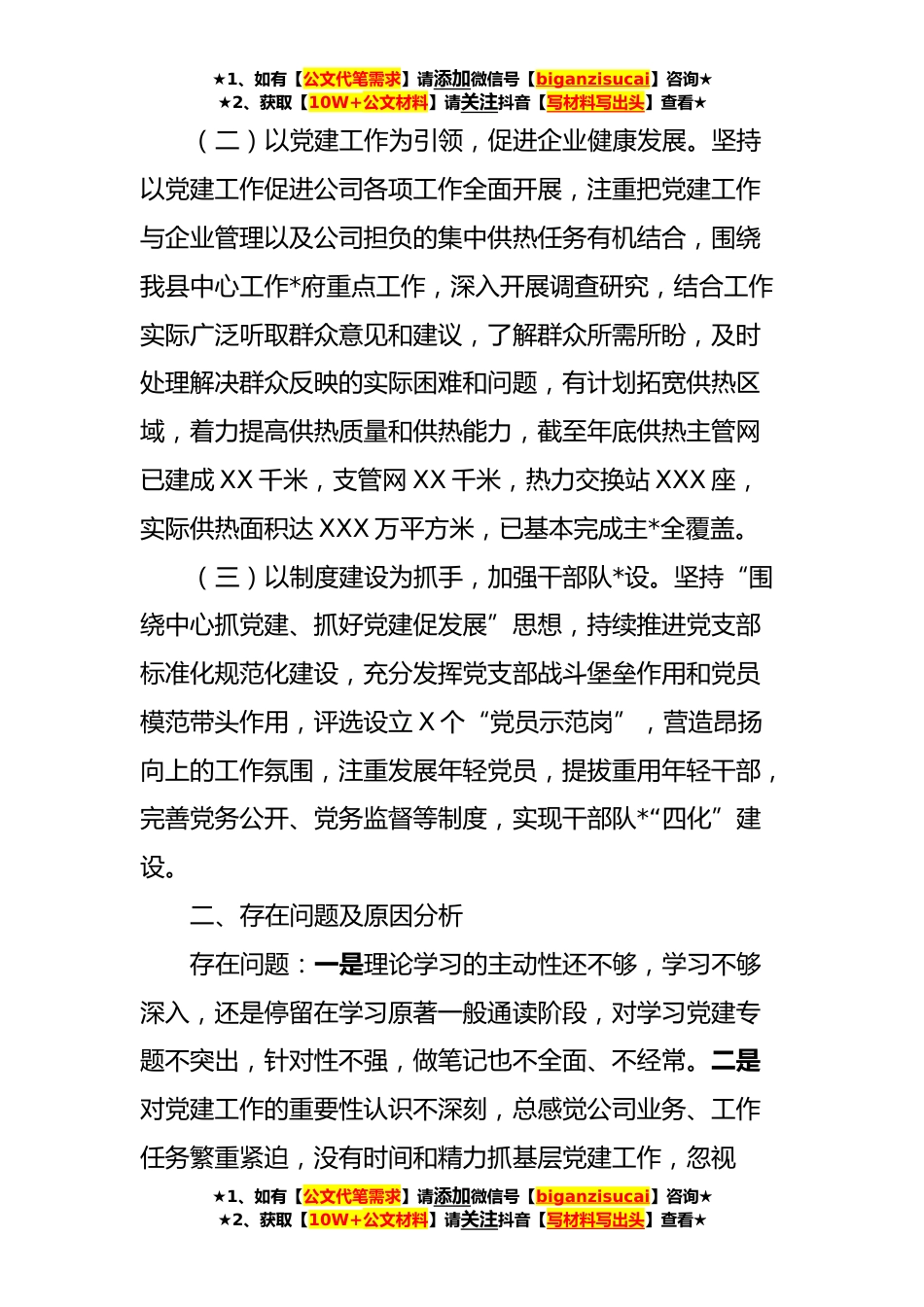 ★1、如有【公文代笔需求】请添加微信号【biganzisucai】咨询★★2、获取【10W+公文材料】请关注抖音【写材料写出头】查看★抓基层党建工作述职报告今年以来,我始终坚持以习近平新时代中国特色社会主义思想为指导,认真贯彻落实党的XX大精神,深刻领悟“两个确立”的决定性意义,增强“四个意识”,坚定“四个自信”,做到“两个维护”,狠抓基层党建各项工作落实。现就具体情况述职如下:一、**年履职情况(一)以政治自觉为核心,切实履行第一责任人职责。一是始终坚持学习党的基本知识和基本理论,不断提升自身修养和工作能力,今年重点学习贯彻习近平新时代中国特色社会主义思想和党的XX大精神,结合工作实际,认真落实省委、XXX市委和XX县委一系列决策部署,促进各项工作全面落实。二是自觉以一般党员的身份...