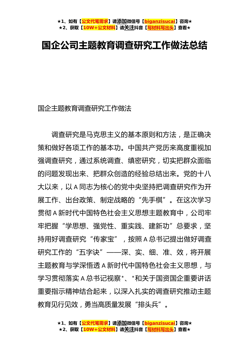 ★1、如有【公文代笔需求】请添加微信号【biganzisucai】咨询★★2、获取【10W+公文材料】请关注抖音【写材料写出头】查看★国企公司主题教育调查研究工作做法总结国企主题教育调查研究工作做法调查研究是马克思主义的基本原则和方法,是正确决策和做好各项工作的基本功。中国共产党历来高度重视加强调查研究,通过系统调查、缜密研究,切实把群众面临的问题发现出来、把群众创造的经验总结出来。党的十八大以来,以A同志为核心的党中央坚持把调查研究作为开展工作、出台政策、制定战略的“先手棋”。在这次学习贯彻A新时代中国特色社会主义思想主题教育中,公司牢牢把握“学思想、强党性、重实践、建新功”总要求,坚持用好调查研究“传家宝”,按照A总书记提出做好调查研究工作的“五字诀”——深、实、细、准、...