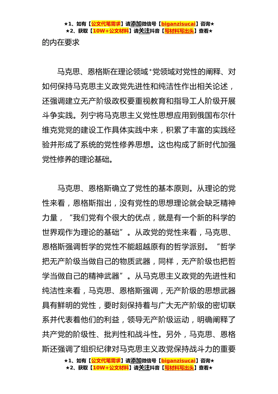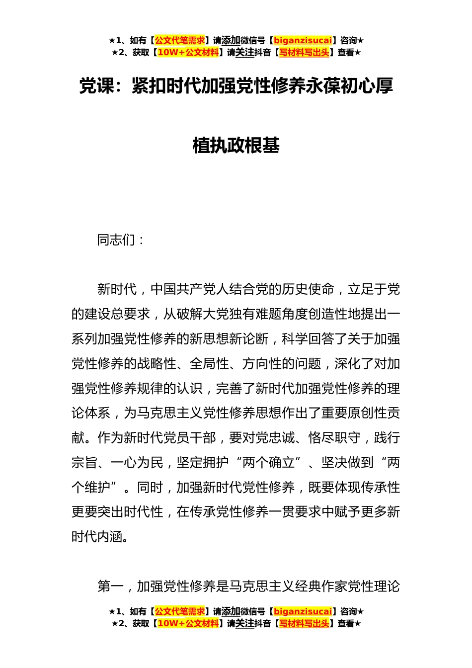★1、如有【公文代笔需求】请添加微信号【biganzisucai】咨询★★2、获取【10W+公文材料】请关注抖音【写材料写出头】查看★党课:紧扣时代加强党性修养永葆初心厚植执政根基同志们:新时代,中国共产党人结合党的历史使命,立足于党的建设总要求,从破解大党独有难题角度创造性地提出一系列加强党性修养的新思想新论断,科学回答了关于加强党性修养的战略性、全局性、方向性的问题,深化了对加强党性修养规律的认识,完善了新时代加强党性修养的理论体系,为马克思主义党性修养思想作出了重要原创性贡献。作为新时代党员干部,要对党忠诚、恪尽职守,践行宗旨、一心为民,坚定拥护“两个确立”、坚决做到“两个维护”。同时,加强新时代党性修养,既要体现传承性更要突出时代性,在传承党性修养一贯要求中赋予更...