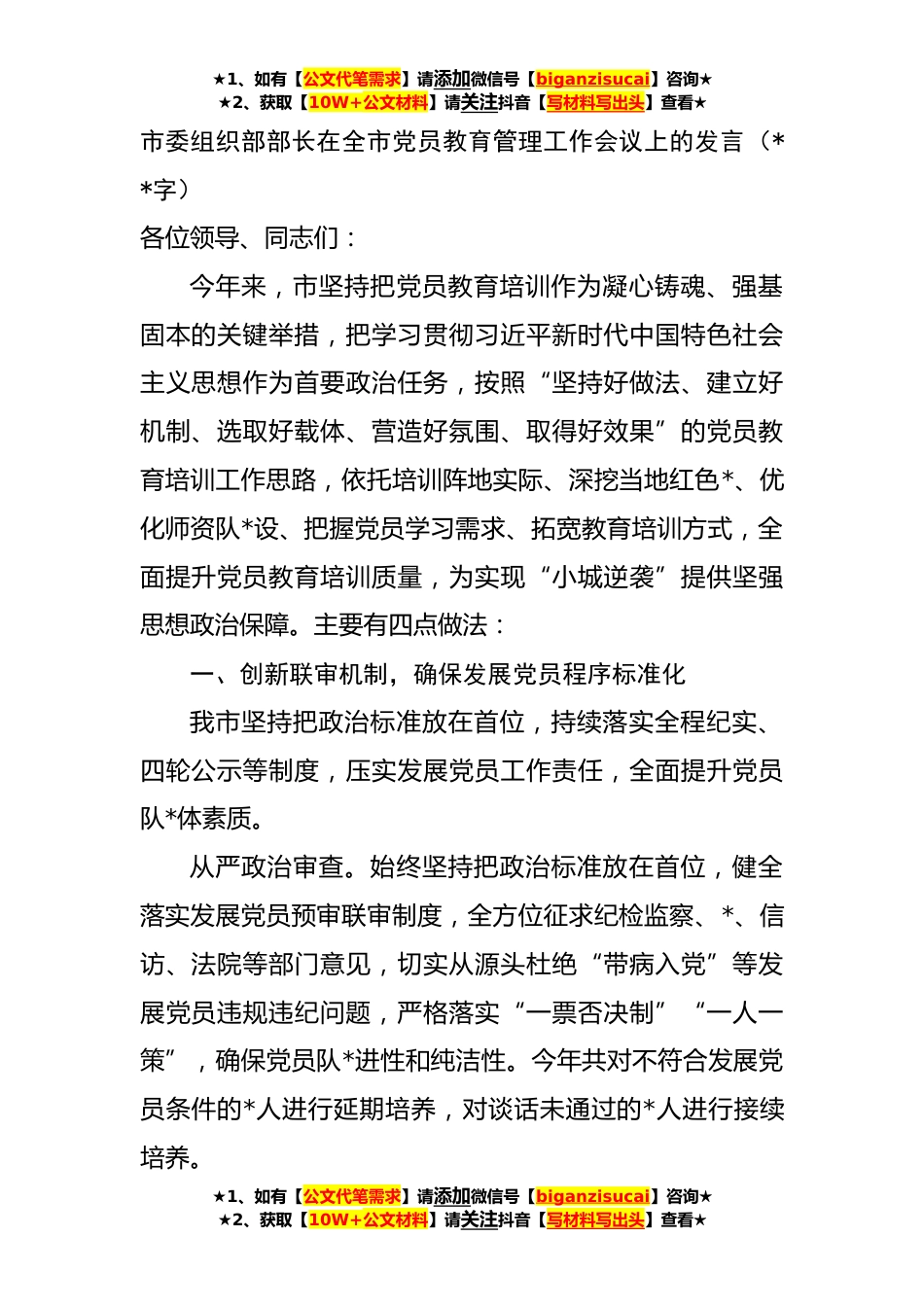 ★1、如有【公文代笔需求】请添加微信号【biganzisucai】咨询★★2、获取【10W+公文材料】请关注抖音【写材料写出头】查看★市委组织部部长在全市党员教育管理工作会议上的发言(**字)各位领导、同志们:今年来,市坚持把党员教育培训作为凝心铸魂、强基固本的关键举措,把学习贯彻习近平新时代中国特色社会主义思想作为首要政治任务,按照“坚持好做法、建立好机制、选取好载体、营造好氛围、取得好效果”的党员教育培训工作思路,依托培训阵地实际、深挖当地红色*、优化师资队*设、把握党员学习需求、拓宽教育培训方式,全面提升党员教育培训质量,为实现“小城逆袭”提供坚强思想政治保障。主要有四点做法:一、创新联审机制,确保发展党员程序标准化我市坚持把政治标准放在首位,持续落实全程纪实、四轮公示...