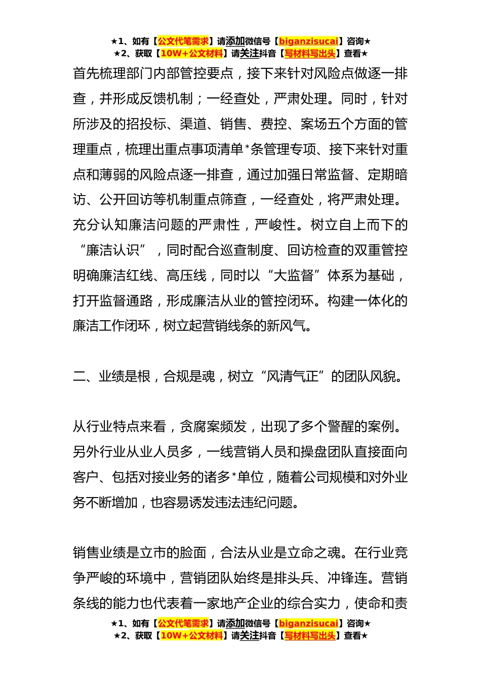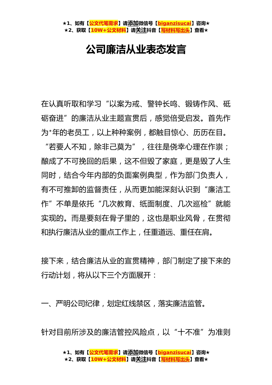 ★1、如有【公文代笔需求】请添加微信号【biganzisucai】咨询★★2、获取【10W+公文材料】请关注抖音【写材料写出头】查看★公司廉洁从业表态发言在认真听取和学习“以案为戒、警钟长鸣、锻铸作风、砥砺奋进”的廉洁从业主题宣贯后,感觉倍受启发。首先作为*年的老员工,以上种种案例,都触目惊心、历历在目。“若要人不知,除非己莫为”,往往是侥幸心理在作祟;酿成了不可挽回的后果,这不但毁了家庭,更是毁了人生同时,结合今年内部的负面案例典型,作为部门负责人,有不可推卸的监督责任,从而更加能深刻认识到“廉洁工作”不单是依托“几次教育、纸面制度、几次巡检”就能实现的。而是要刻在骨子里的,这也是职业风骨,在贯彻和执行廉洁从业的重点工作上,任重道远、重任在肩。接下来,结合廉洁从业的宣贯精...