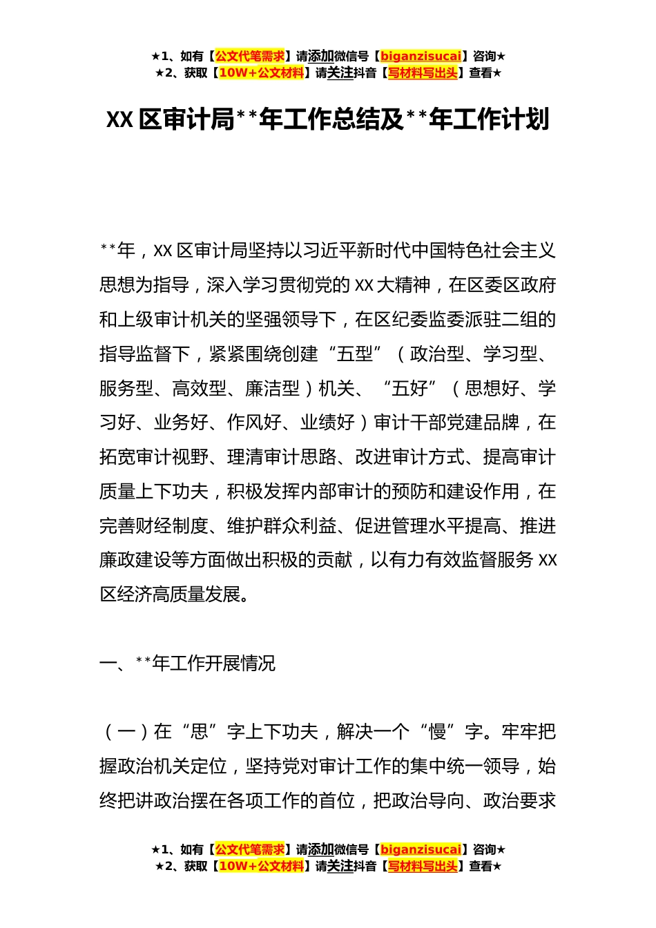 ★1、如有【公文代笔需求】请添加微信号【biganzisucai】咨询★★2、获取【10W+公文材料】请关注抖音【写材料写出头】查看★XX区审计局**年工作总结及**年工作计划**年,XX区审计局坚持以习近平新时代中国特色社会主义思想为指导,深入学习贯彻党的XX大精神,在区委区政府和上级审计机关的坚强领导下,在区纪委监委派驻二组的指导监督下,紧紧围绕创建“五型”(政治型、学习型、服务型、高效型、廉洁型)机关、“五好”(思想好、学习好、业务好、作风好、业绩好)审计干部党建品牌,在拓宽审计视野、理清审计思路、改进审计方式、提高审计质量上下功夫,积极发挥内部审计的预防和建设作用,在完善财经制度、维护群众利益、促进管理水平提高、推进廉政建设等方面做出积极的贡献,以有力有效监督服务XX区经济高质...
