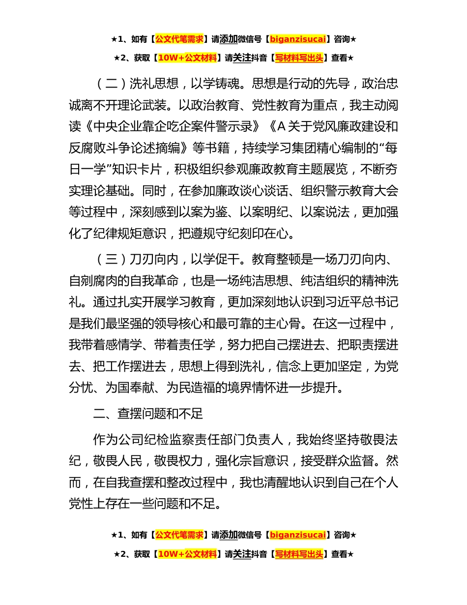 ★1、如有【公文代笔需求】请添加微信号【biganzisucai】咨询★★2、获取【10W+公文材料】请关注抖音【写材料写出头】查看★纪检干部教育整顿党性分析按照XX“”相关工作安排,我认真对照六个方面问题进行个人问题查摆和整改纠治,深刻剖析了自身存在问题的根源,制定了切实可行的整改措施,严肃认真地进行了查纠整改工作,现将个人党性分析情况报告如下。一、认识和体会通过持续接受思想政治教育、警示教育、纪法教育,坚持不断检视整治、巩固提升,我对这次纪检监察干部队*育整顿工作有了更加深刻的认识。(一)淬炼灵魂,铸就忠诚。作为一名党员,我时刻铭记着共产党人的使命。随着纪检监察干部队*育整顿工作的开展,我更加深刻地认识到,党性是纪检监察干部的政治灵魂,是我们履行监督职责、捍卫党纪党规的坚...