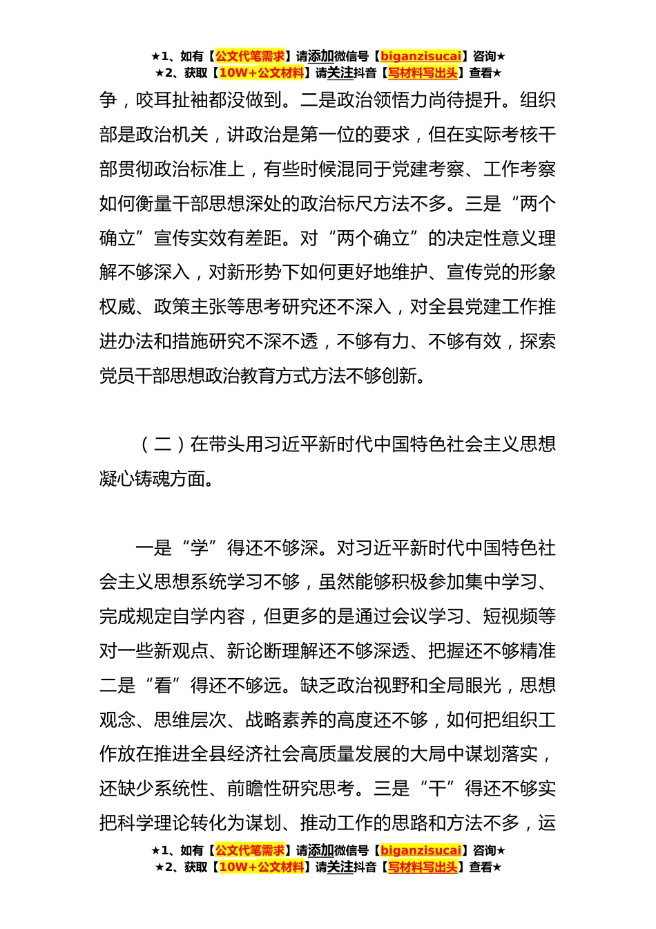 ★1、如有【公文代笔需求】请添加微信号【biganzisucai】咨询★★2、获取【10W+公文材料】请关注抖音【写材料写出头】查看★民主生活会对照检查材料(*按照关于开好**年度民主生活会的通知要求,我深刻把握主题,坚持以习近平新时代中国特色社会主义思想为指导,以深入学习贯彻党的XX大精神为主线,对照“六个方面”内容,深入开展谈心谈话、广泛征求意见建议、深入查摆问题不足、深刻剖析问题根源、明确务实整改措施现将对照检查情况报告如下:一、存在的主要问题(一)在带头深刻领悟“两个确立”的决定性意义,增强“四个意识”、坚定“四个自信”、做到“两个维护”方面。一是政治判断力有待加强。对上级通报的、已经定性的问题开展斗争能够态度坚决、行动自觉,但在面对身边熟悉同志的不当言行时甚至工作中的...