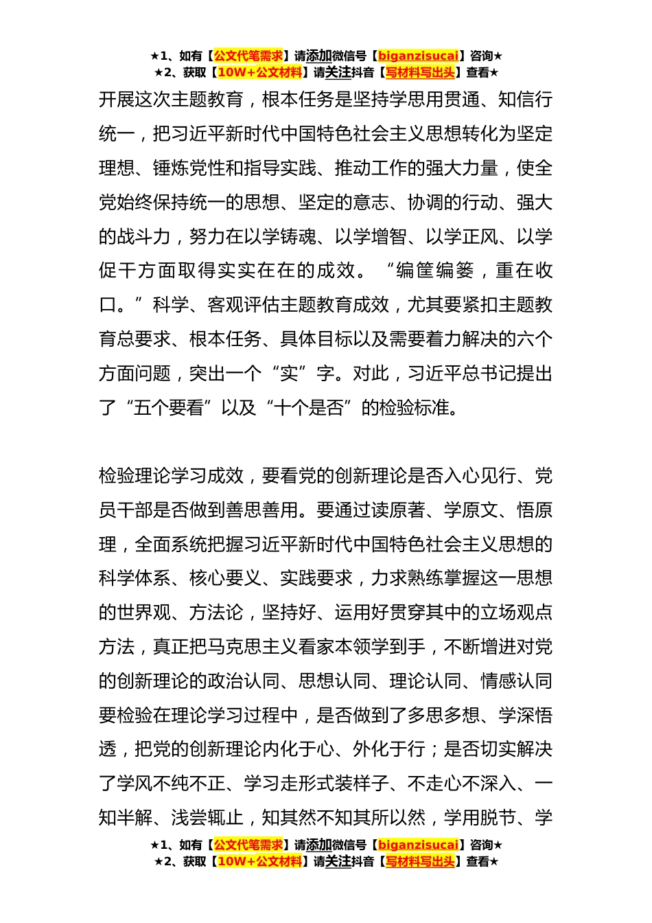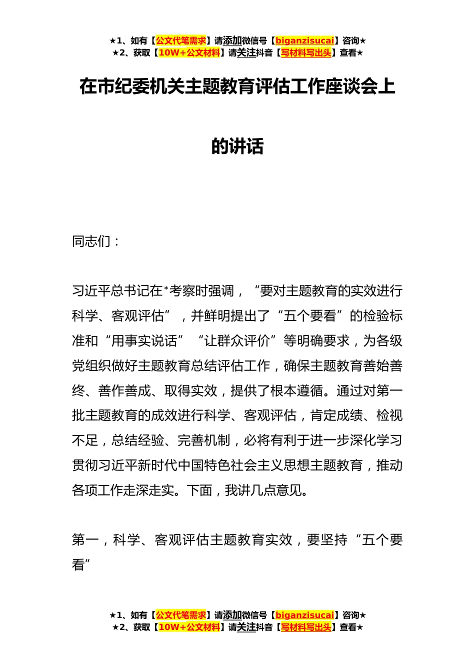 ★1、如有【公文代笔需求】请添加微信号【biganzisucai】咨询★★2、获取【10W+公文材料】请关注抖音【写材料写出头】查看★在市纪委机关主题教育评估工作座谈会上的讲话同志们:习近平总书记在*考察时强调,“要对主题教育的实效进行科学、客观评估”,并鲜明提出了“五个要看”的检验标准和“用事实说话”“让群众评价”等明确要求,为各级党组织做好主题教育总结评估工作,确保主题教育善始善终、善作善成、取得实效,提供了根本遵循。通过对第一批主题教育的成效进行科学、客观评估,肯定成绩、检视不足,总结经验、完善机制,必将有利于进一步深化学习贯彻习近平新时代中国特色社会主义思想主题教育,推动各项工作走深走实。下面,我讲几点意见。第一,科学、客观评估主题教育实效,要坚持“五个要看”★1、...