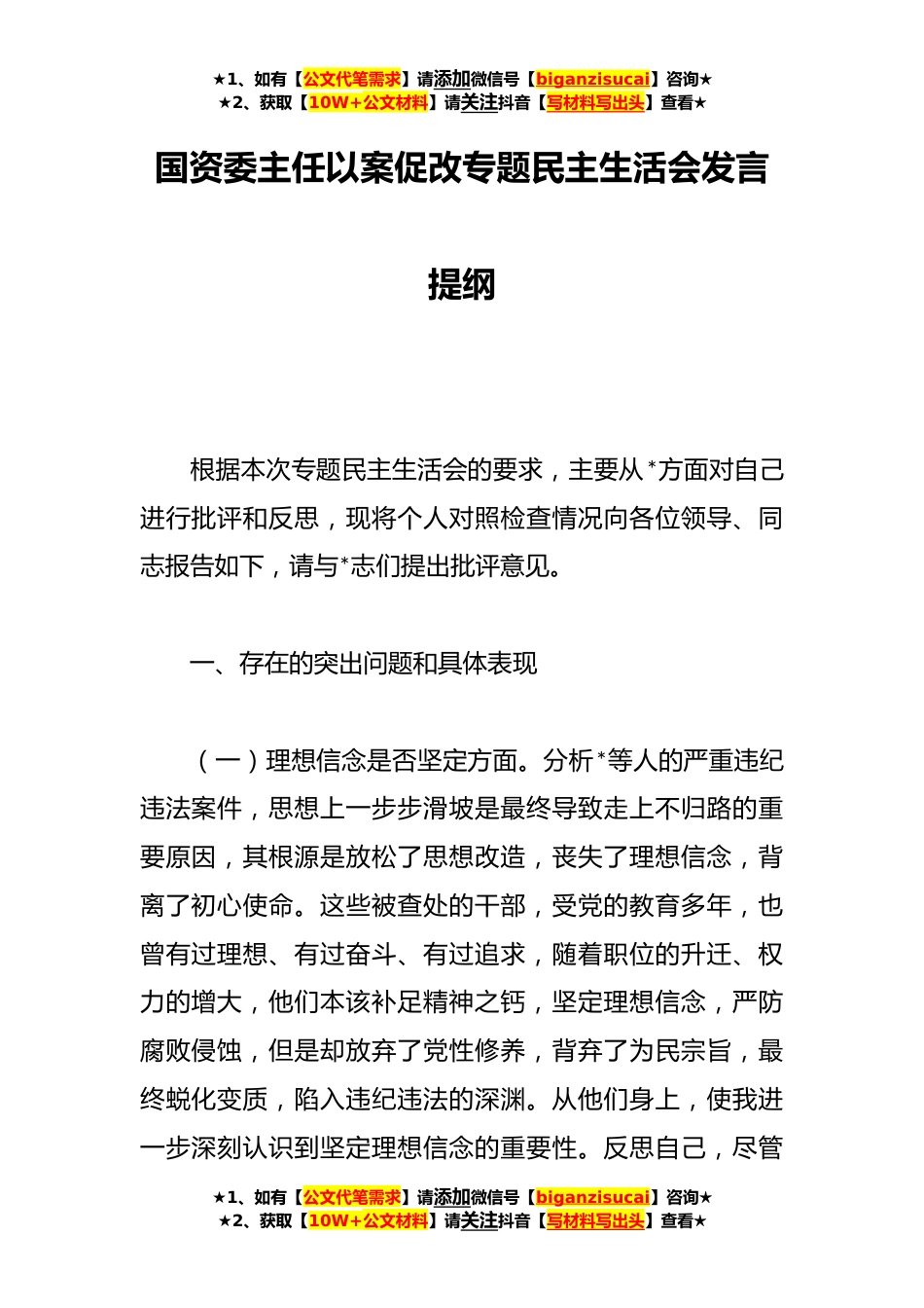 ★1、如有【公文代笔需求】请添加微信号【biganzisucai】咨询★★2、获取【10W+公文材料】请关注抖音【写材料写出头】查看★国资委主任以案促改专题民主生活会发言提纲根据本次专题民主生活会的要求,主要从*方面对自己进行批评和反思,现将个人对照检查情况向各位领导、同志报告如下,请与*志们提出批评意见。一、存在的突出问题和具体表现(一)理想信念是否坚定方面。分析*等人的严重违纪违法案件,思想上一步步滑坡是最终导致走上不归路的重要原因,其根源是放松了思想改造,丧失了理想信念,背离了初心使命。这些被查处的干部,受党的教育多年,也曾有过理想、有过奋斗、有过追求,随着职位的升迁、权力的增大,他们本该补足精神之钙,坚定理想信念,严防腐败侵蚀,但是却放弃了党性修养,背弃了为民宗旨,最...
