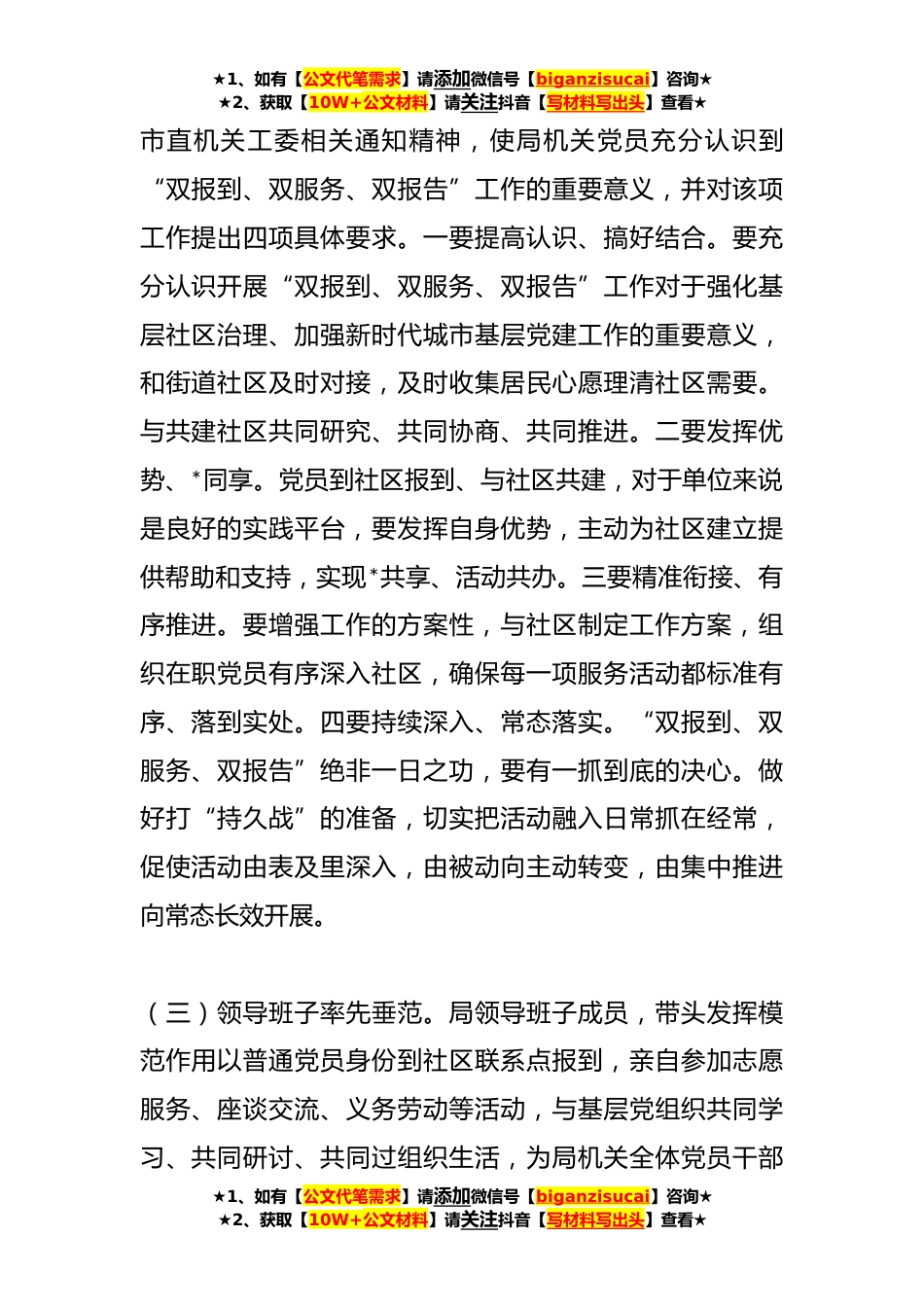 ★1、如有【公文代笔需求】请添加微信号【biganzisucai】咨询★★2、获取【10W+公文材料】请关注抖音【写材料写出头】查看★市教育局开展“双报到、双服务、双报告”深化党建引领基层治理活动情况报告为深入贯彻党的XX大精神,推动主题教育走深走实,发挥党组织的战斗堡垒作用,市教育局全面推进在职党员进社区“双报到、双服务、双报告”工作,充分调动在职党员参与社区共建的积极性,为群众办实事、办好事、办身边事。现将我局“双报到、双服务、双报告”开展情况汇报如下。一、加强组织领导(一)研究制定方案。为确保“双报到、双服务、双报告”工作常态化制度化开展,局党组把开展该项工作纳入教育系统党建工作总体规划,结合实际,研究制定实施方案。(二)积极组织启动。*上旬局机关组织召开启动会,传达★...