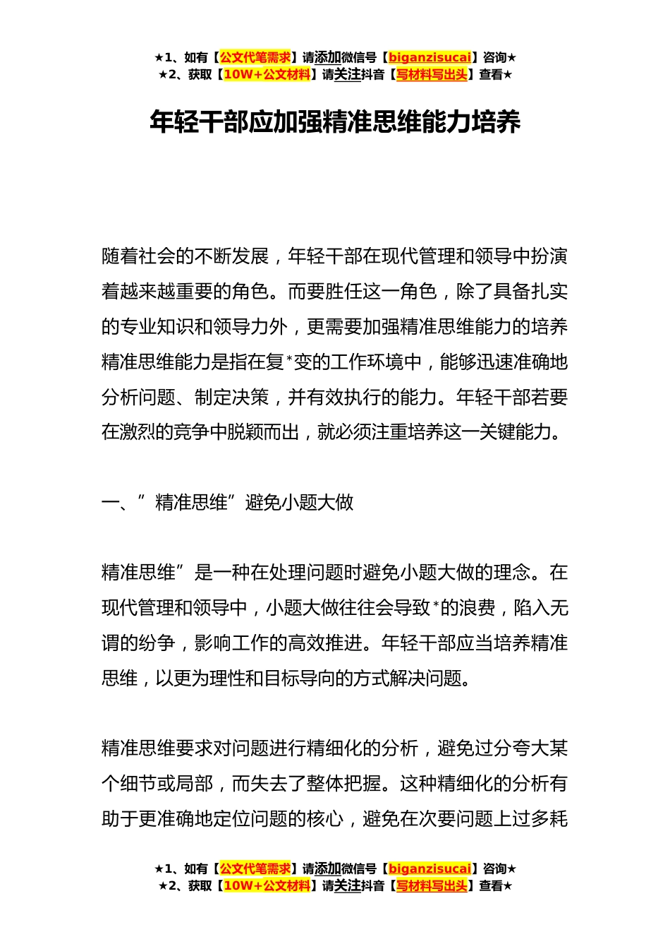 ★1、如有【公文代笔需求】请添加微信号【biganzisucai】咨询★★2、获取【10W+公文材料】请关注抖音【写材料写出头】查看★年轻干部应加强精准思维能力培养随着社会的不断发展,年轻干部在现代管理和领导中扮演着越来越重要的角色。而要胜任这一角色,除了具备扎实的专业知识和领导力外,更需要加强精准思维能力的培养精准思维能力是指在复*变的工作环境中,能够迅速准确地分析问题、制定决策,并有效执行的能力。年轻干部若要在激烈的竞争中脱颖而出,就必须注重培养这一关键能力。一、”精准思维”避免小题大做精准思维”是一种在处理问题时避免小题大做的理念。在现代管理和领导中,小题大做往往会导致*的浪费,陷入无谓的纷争,影响工作的高效推进。年轻干部应当培养精准思维,以更为理性和目标导向的方式解...