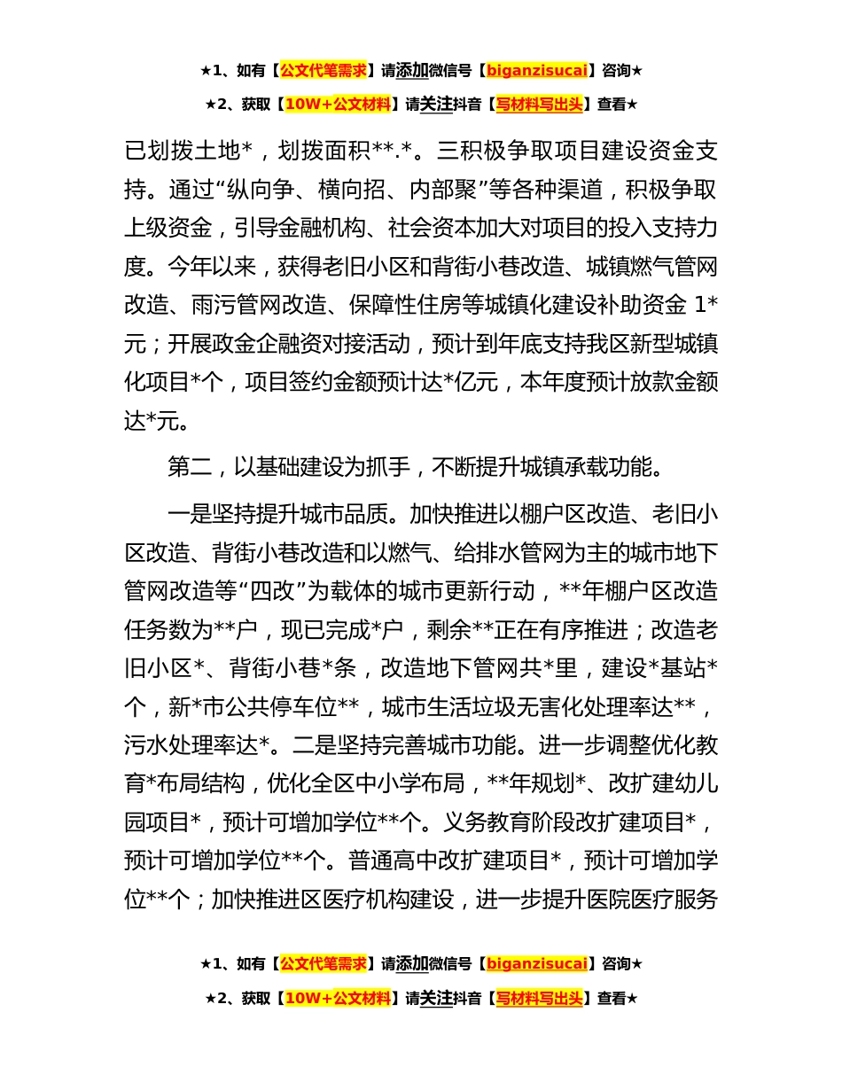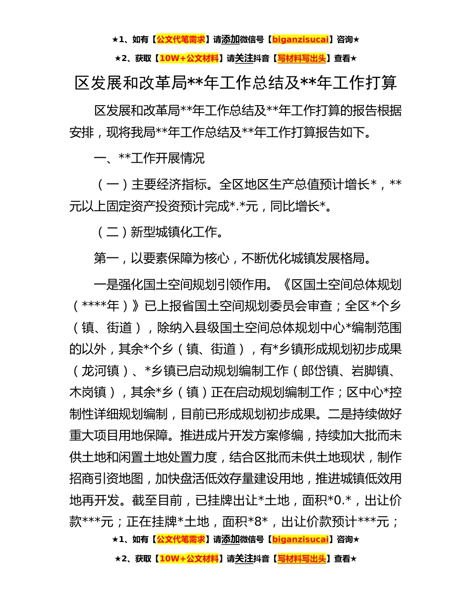 ★1、如有【公文代笔需求】请添加微信号【biganzisucai】咨询★★2、获取【10W+公文材料】请关注抖音【写材料写出头】查看★区发展和改革局**年工作总结及**年工作打算区发展和改革局**年工作总结及**年工作打算的报告根据安排,现将我局**年工作总结及**年工作打算报告如下。一、**工作开展情况(一)主要经济指标。全区地区生产总值预计增长*,**元以上固定资产投资预计完成*.*元,同比增长*。(二)新型城镇化工作。第一,以要素保障为核心,不断优化城镇发展格局。一是强化国土空间规划引领作用。《区国土空间总体规划(****年)》已上报省国土空间规划委员会审查;全区*个乡(镇、街道),除纳入县级国土空间总体规划中心*编制范围的以外,其余*个乡(镇、街道),有*乡镇形成规划初步成果(龙河镇)、*乡镇...