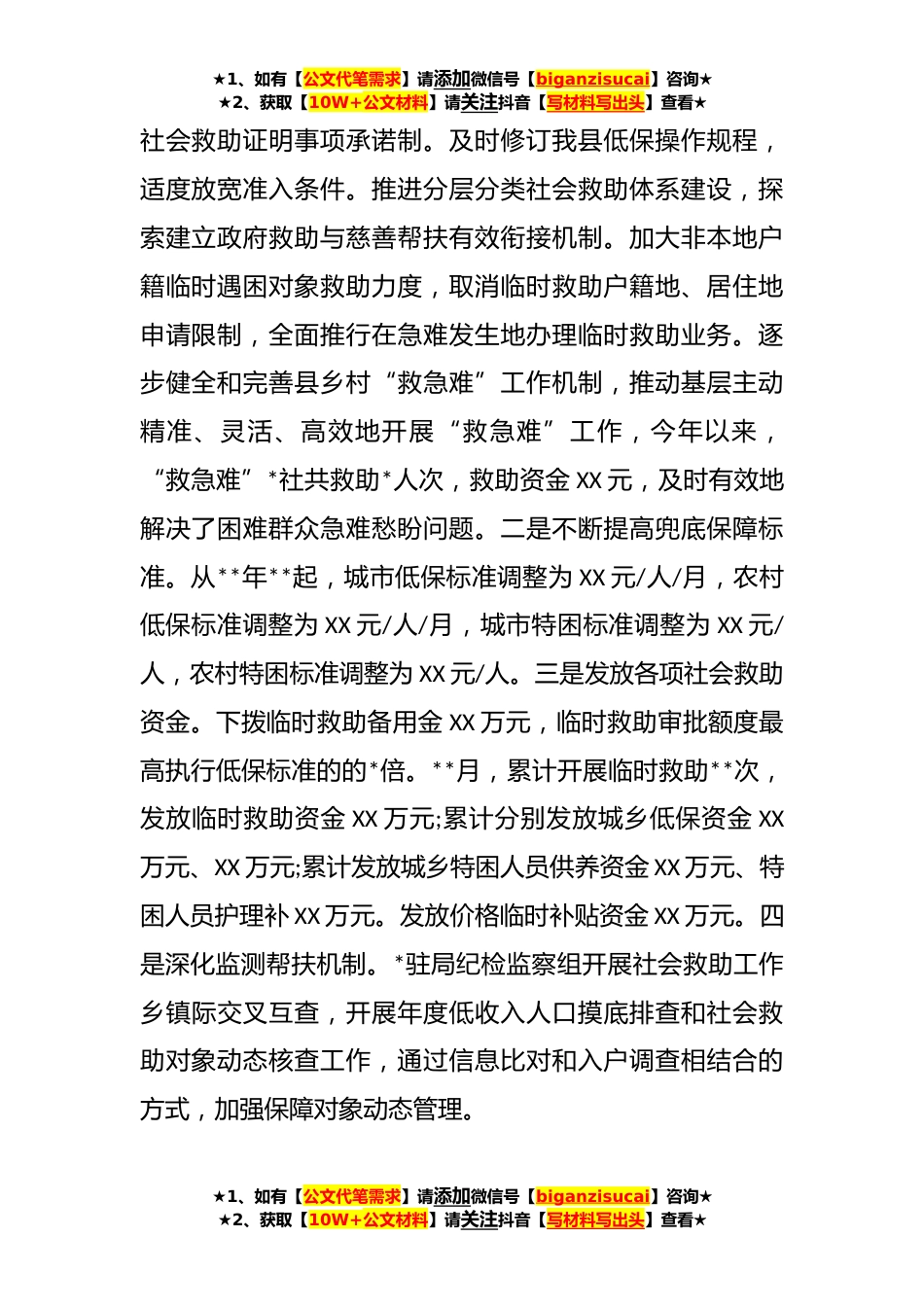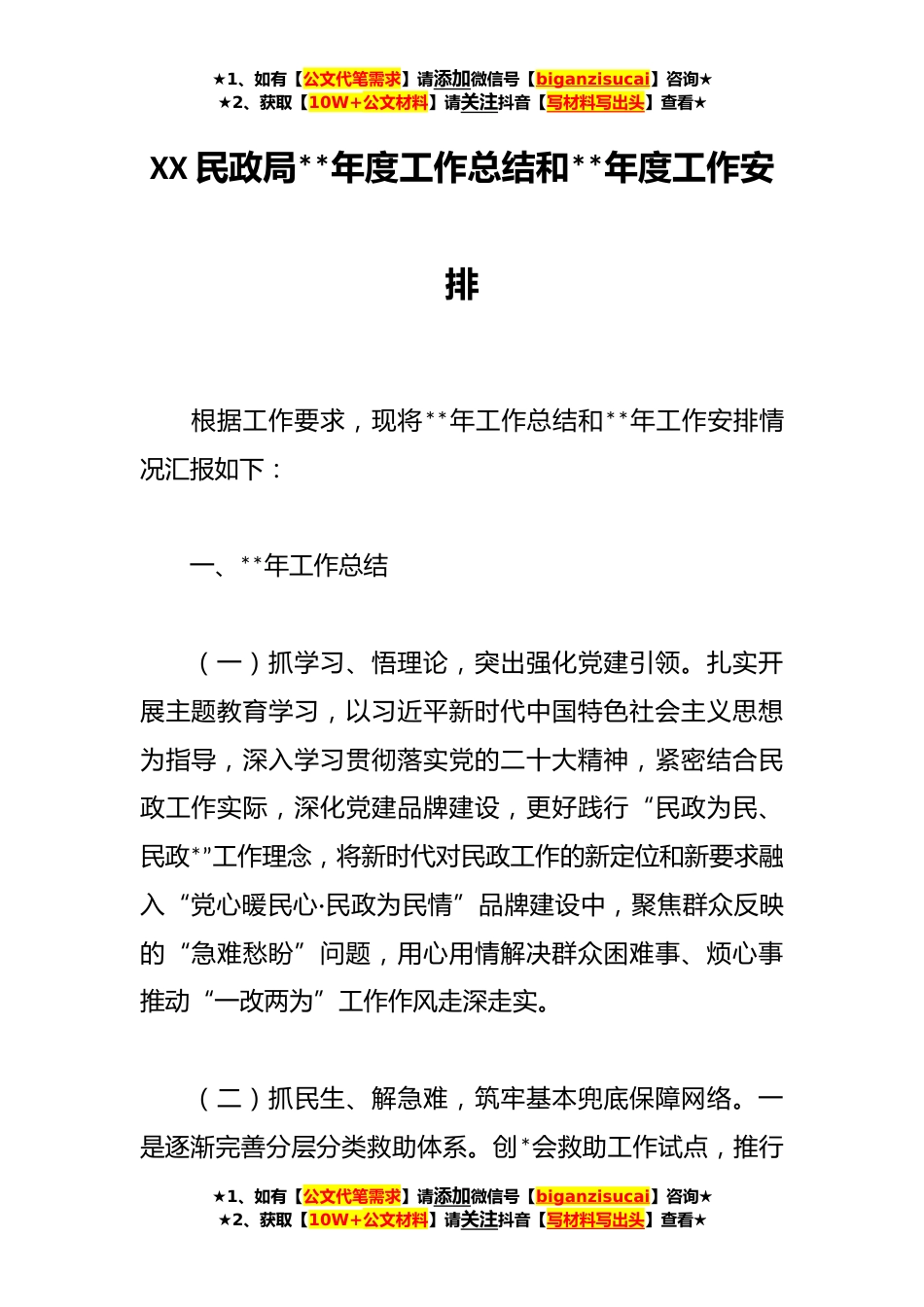 ★1、如有【公文代笔需求】请添加微信号【biganzisucai】咨询★★2、获取【10W+公文材料】请关注抖音【写材料写出头】查看★XX民政局**年度工作总结和**年度工作安排根据工作要求,现将**年工作总结和**年工作安排情况汇报如下:一、**年工作总结(一)抓学习、悟理论,突出强化党建引领。扎实开展主题教育学习,以习近平新时代中国特色社会主义思想为指导,深入学习贯彻落实党的二十大精神,紧密结合民政工作实际,深化党建品牌建设,更好践行“民政为民、民政*”工作理念,将新时代对民政工作的新定位和新要求融入“党心暖民心·民政为民情”品牌建设中,聚焦群众反映的“急难愁盼”问题,用心用情解决群众困难事、烦心事推动“一改两为”工作作风走深走实。(二)抓民生、解急难,筑牢基本兜底保障网络。一是逐...