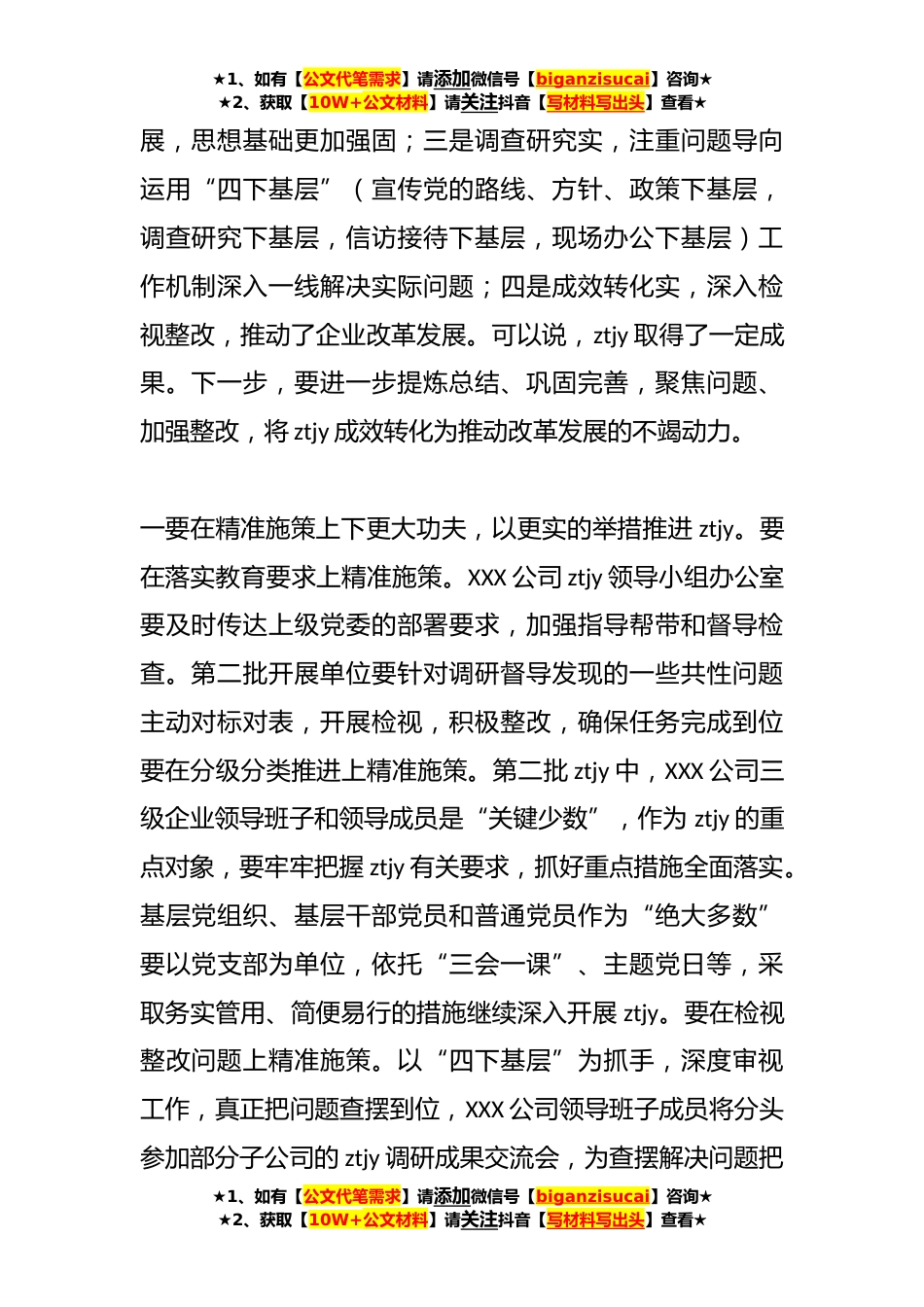 ★1、如有【公文代笔需求】请添加微信号【biganzisucai】咨询★★2、获取【10W+公文材料】请关注抖音【写材料写出头】查看★在主题教育总结会上的讲话同志们:大家上午好!今天,我们召开XXX公司扎实深入推进第二批学习贯彻习近平新时代中国特色社会主义思想ztjy专题会,对第二批ztjy开展情况进行通报,并对下一步ztjy工作进行部署。刚才,XX公司和XX公司两个单位进行了交流发言。XXX同志代表XXX公司党委ztjy领导小组通报了第二批ztjy开展情况,并对下一步任务进行了部署。总体来看,自第二批ztjy启动以来,在上级党委ztjy领导小组的精心指导与悉心帮助下,XXX公司第二批ztjy开展单位自觉将高质量开展好ztjy作为重大政治任务,牢牢把握目标要求,统筹谋划,精心组织,周密安排,推扎实进各项部署,体现了如下特点...