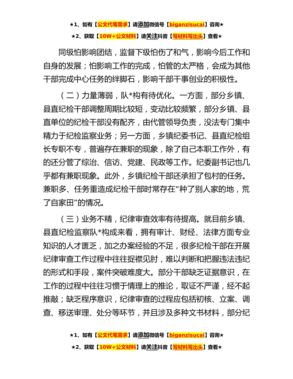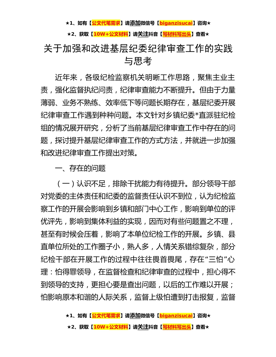 ★1、如有【公文代笔需求】请添加微信号【biganzisucai】咨询★★2、获取【10W+公文材料】请关注抖音【写材料写出头】查看★关于加强和改进基层纪委纪律审查工作的实践与思考近年来,各级纪检监察机关明晰工作思路,聚焦主业主责,强化监督执纪问责,纪律审查能力不断提升。但由于力量薄弱、业务不熟练、效率低下等问题长期存在,基层纪委开展纪律审查工作遇到种种问题。本文针对乡镇纪委*直派驻纪检组的情况展开研究,分析了当前基层纪律审查工作中存在的问题,探讨提升基层纪律审查工作的方式方法,并就进一步加强和改进纪律审查工作提出对策。一、存在的问题(一)认识不足,排除干扰能力有待提升。部分领导干部对党委的主体责任和纪委的监督责任认识不到位,认为纪检监察工作的开展会影响到乡镇和部门中心工作...