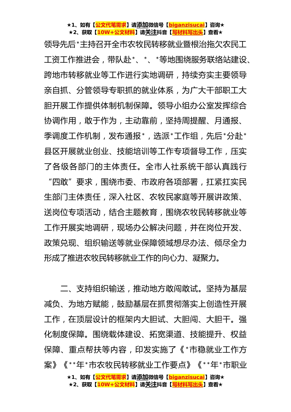 ★1、如有【公文代笔需求】请添加微信号【biganzisucai】咨询★★2、获取【10W+公文材料】请关注抖音【写材料写出头】查看★农牧民转移就业工作经验交流材料就业是民生之本、稳定之基、发展之源。今年以来,市委、市政府将农牧民转移就业作为保民生、促发展、促和谐的重大民生工程来抓,作为践行“敢为、敢闯、敢干敢首创”要求具体举措来抓,持续加强组织领导、突出政策引领、强化组织*,不断推动农牧民转移就业各项工作向纵深推进。截至目前,全市实现农牧民转移就业*.*人,创收*.*亿元,分别完成自治区目标任务的*6*%和*8*%,其中脱贫人口转移就业7*万人,*底已超额完成自治区年初目标任务。一、建强体制机制,推动干部敢于作为。坚持为担当者担当、为实干者撑腰、为创造者开道,市委、市政府持续激发广大党...