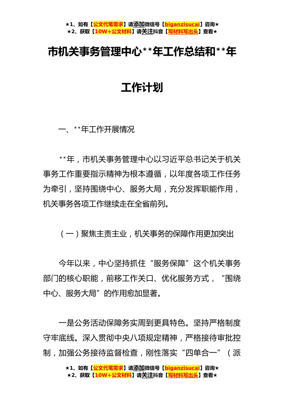 ★1、如有【公文代笔需求】请添加微信号【biganzisucai】咨询★★2、获取【10W+公文材料】请关注抖音【写材料写出头】查看★市机关事务管理中心**年工作总结和**年工作计划一、**年工作开展情况**年,市机关事务管理中心以习近平总书记关于机关事务工作重要指示精神为根本遵循,以年度各项工作任务为牵引,坚持围绕中心、服务大局,充分发挥职能作用,机关事务各项工作继续走在全省前列。(一)聚焦主责主业,机关事务的保障作用更加突出今年以来,中心坚持抓住“服务保障”这个机关事务部门的核心职能,前移工作关口、优化服务方式,“围绕中心、服务大局”的作用愈加显著。一是公务活动保障务实周到更具特色。坚持严格制度守牢底线。深入贯彻中央八项规定精神,严格接待审批控制,加强公务接待监督检查,刚性落...