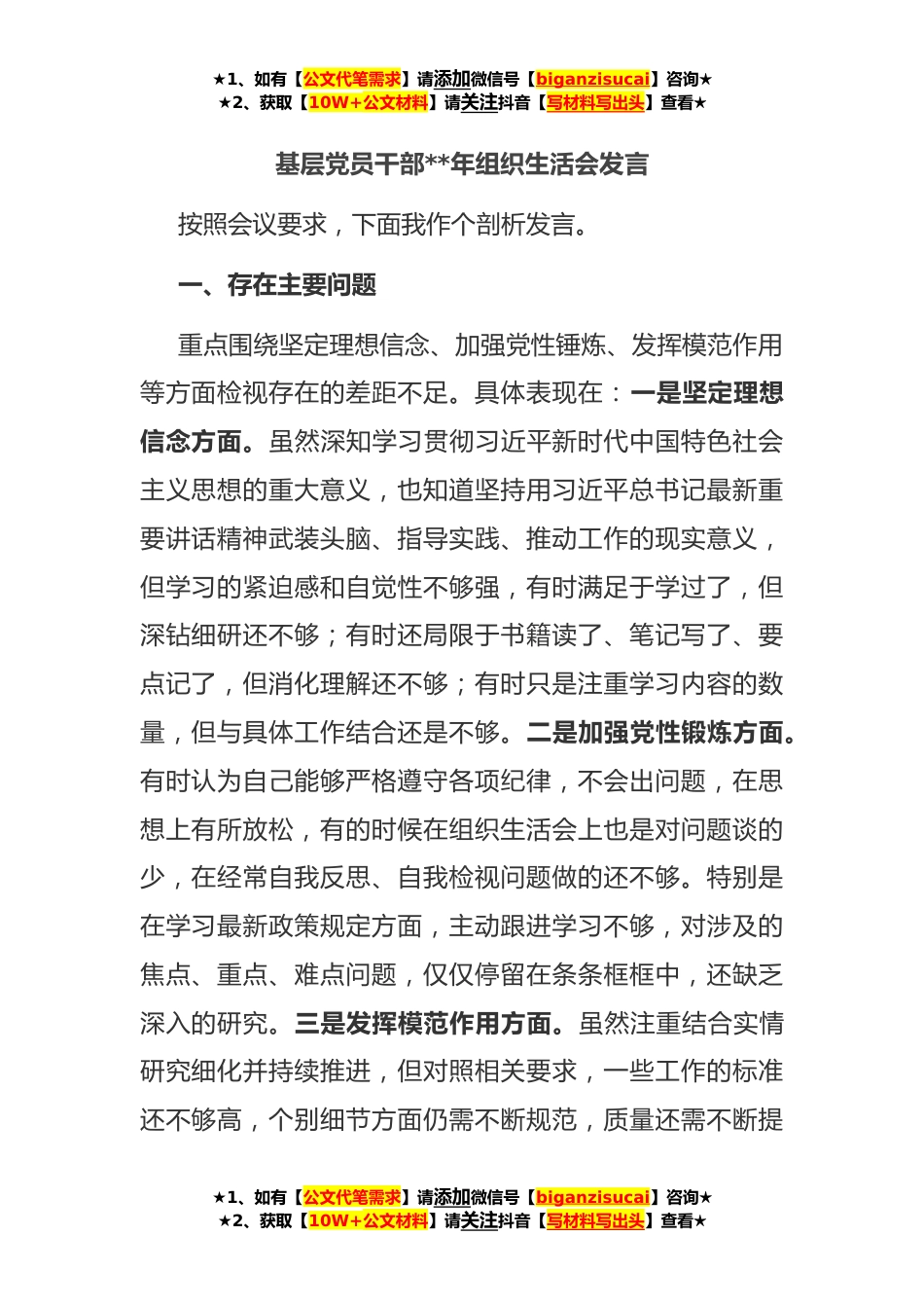 ★1、如有【公文代笔需求】请添加微信号【biganzisucai】咨询★★2、获取【10W+公文材料】请关注抖音【写材料写出头】查看★基层党员干部**年组织生活会发言按照会议要求,下面我作个剖析发言。一、存在主要问题重点围绕坚定理想信念、加强党性锤炼、发挥模范作用等方面检视存在的差距不足。具体表现在:一是坚定理想信念方面。虽然深知学习贯彻习近平新时代中国特色社会主义思想的重大意义,也知道坚持用习近平总书记最新重要讲话精神武装头脑、指导实践、推动工作的现实意义,但学习的紧迫感和自觉性不够强,有时满足于学过了,但深钻细研还不够;有时还局限于书籍读了、笔记写了、要点记了,但消化理解还不够;有时只是注重学习内容的数量,但与具体工作结合还是不够。二是加强党性锻炼方面。有时认为自己能够...
