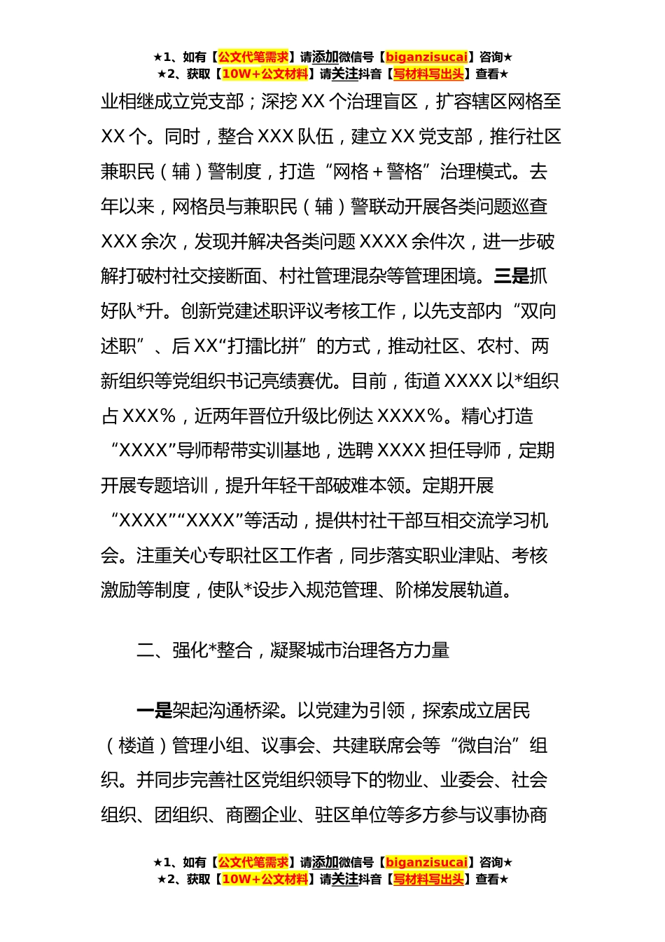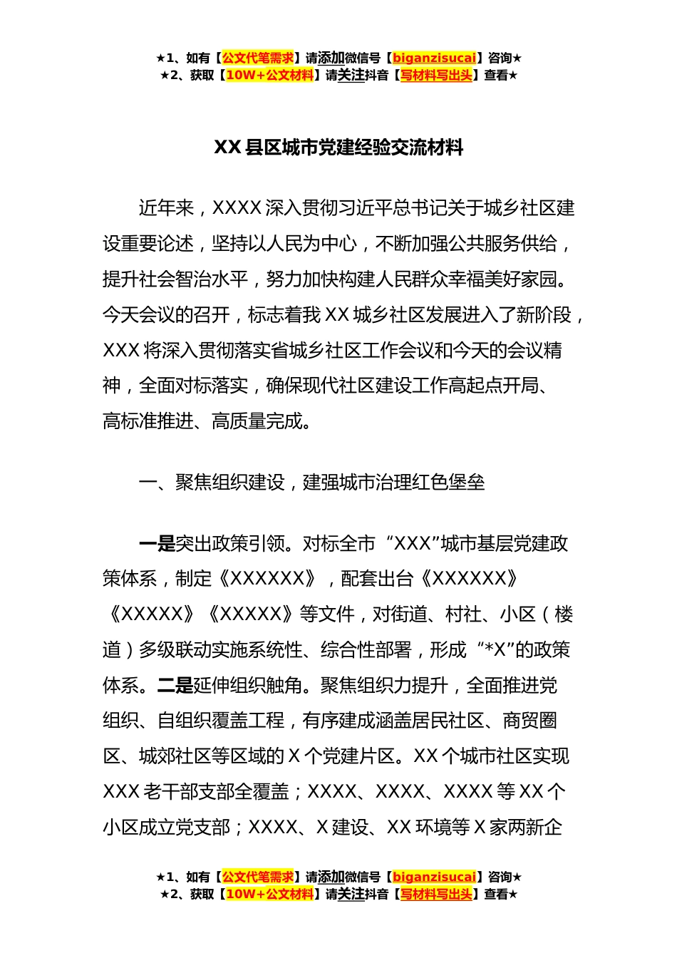 ★1、如有【公文代笔需求】请添加微信号【biganzisucai】咨询★★2、获取【10W+公文材料】请关注抖音【写材料写出头】查看★XX县区城市党建经验交流材料近年来,XXXX深入贯彻习近平总书记关于城乡社区建设重要论述,坚持以人民为中心,不断加强公共服务供给,提升社会智治水平,努力加快构建人民群众幸福美好家园。今天会议的召开,标志着我XX城乡社区发展进入了新阶段,XXX将深入贯彻落实省城乡社区工作会议和今天的会议精神,全面对标落实,确保现代社区建设工作高起点开局、高标准推进、高质量完成。一、聚焦组织建设,建强城市治理红色堡垒一是突出政策引领。对标全市“XXX”城市基层党建政策体系,制定《XXXXXX》,配套出台《XXXXXX》《XXXXX》《XXXXX》等文件,对街道、村社、小区(楼道)多级联动实施系统...